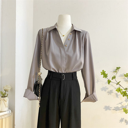法式高级感灰色气质古巴V领长袖衬衫女秋季设计感洋气小金扣上衣