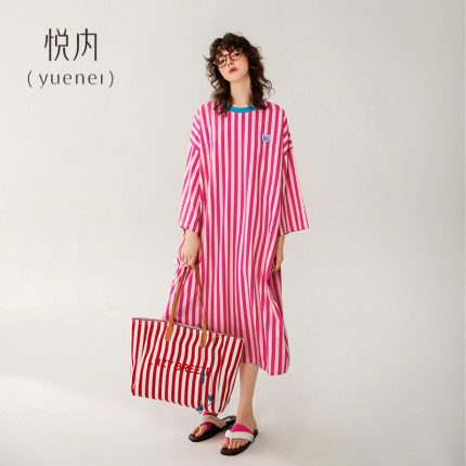 悦内睡裙女款睡衣春秋季纯棉长袖家居服时尚加大码多巴胺条纹长款