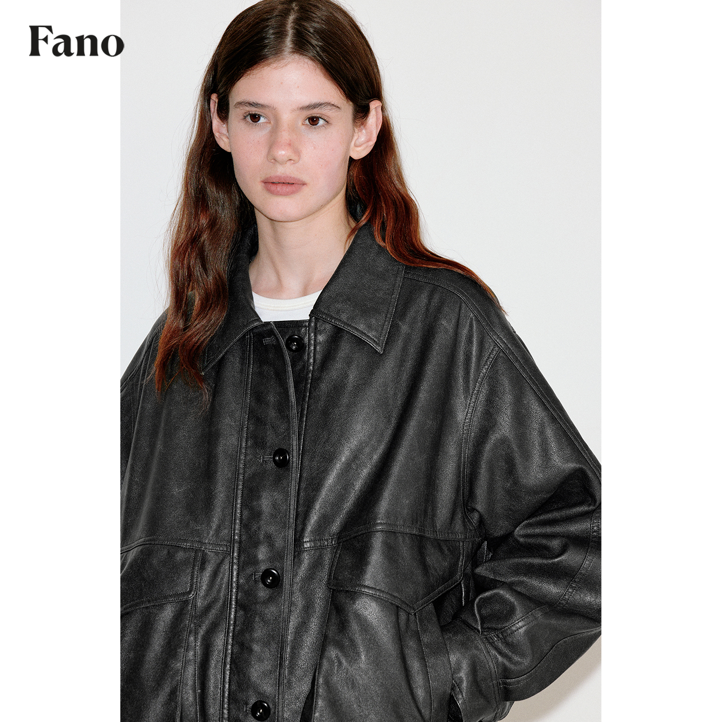 范洛Fano 时髦酷飒风做旧立体袋金属扣水洗皮衣外套女高级感秋季