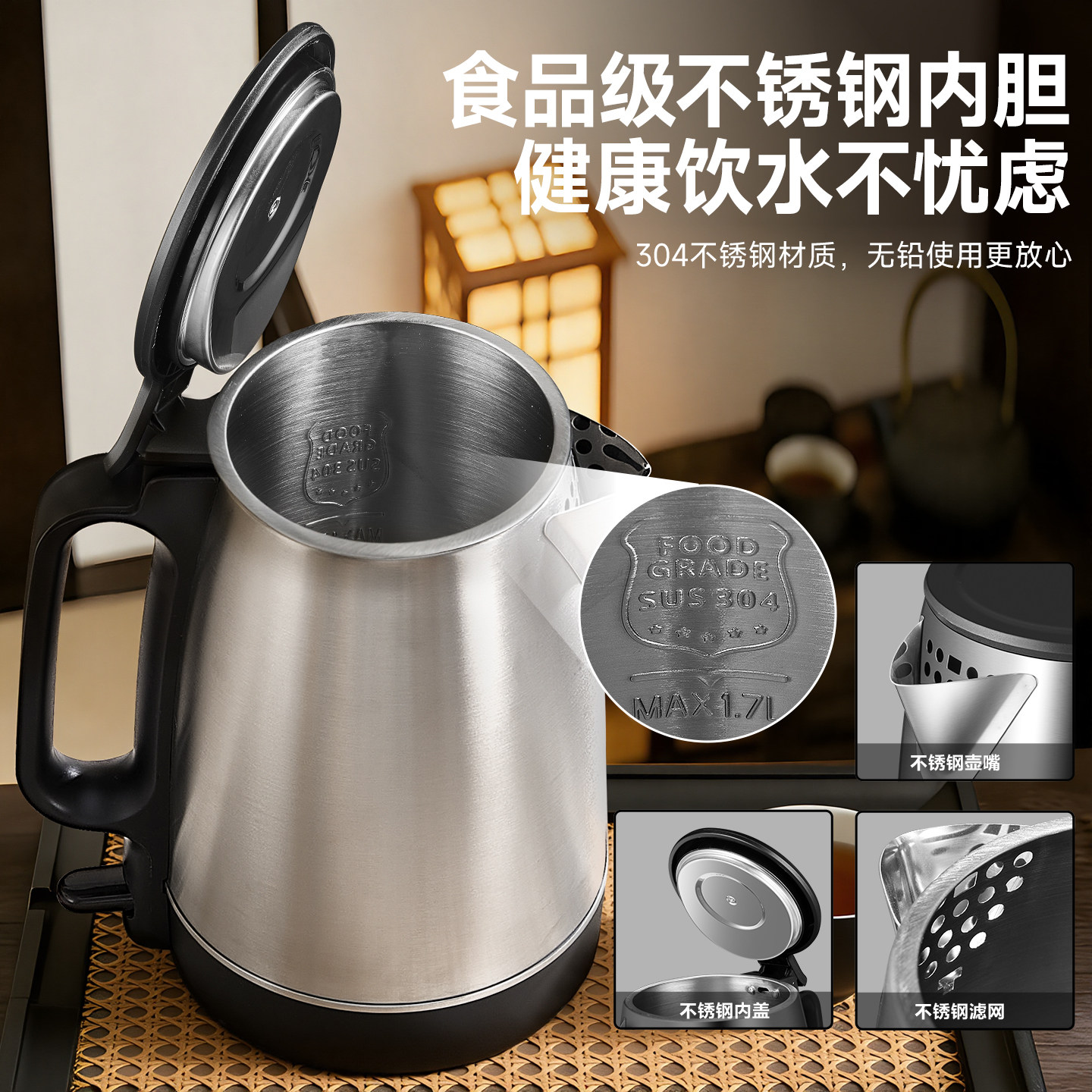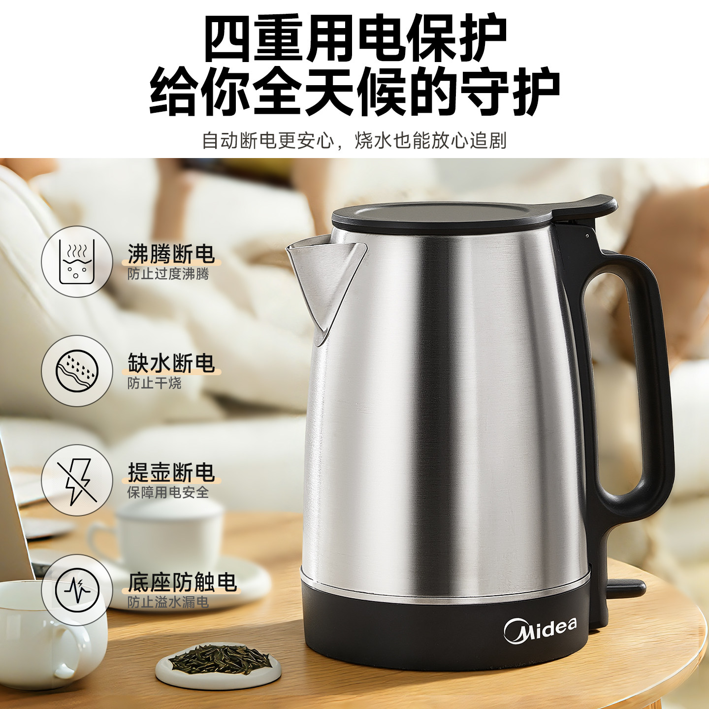 美的电热水壶大功率家用大容量烧水壶食品级不锈钢水壶官方正品