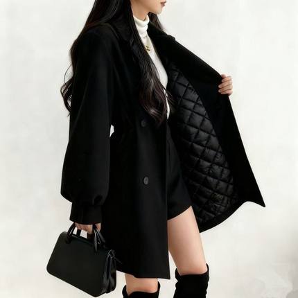 夹棉黑色毛呢外套女中长款秋冬季小个子加厚风衣小香风短呢子大衣