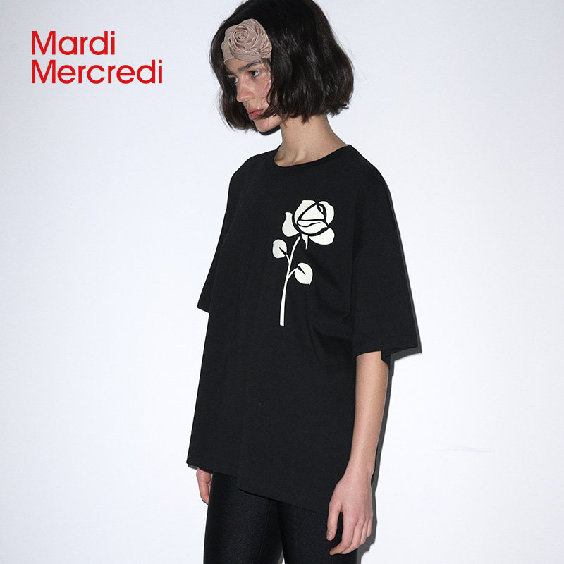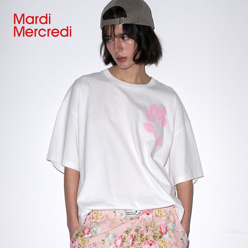 MardiMercredi男友风玫瑰短袖t恤宽松落肩五分袖上衣后背logo新款