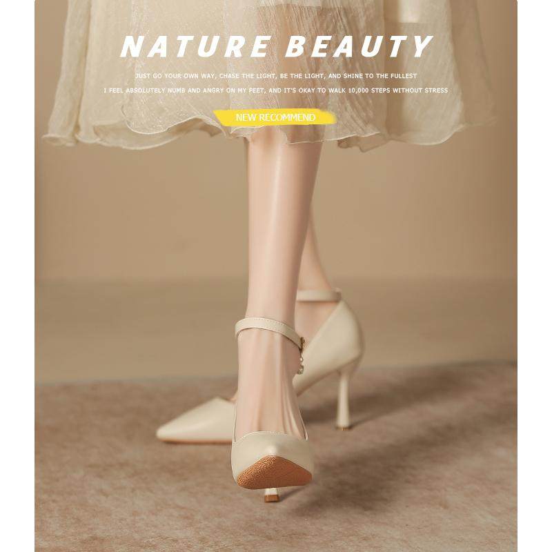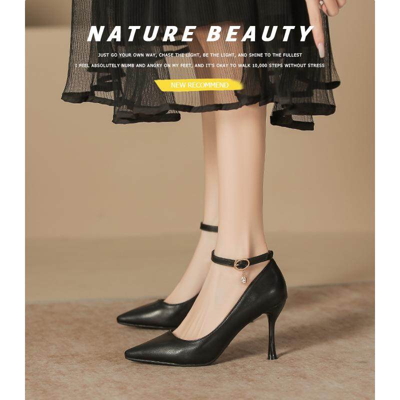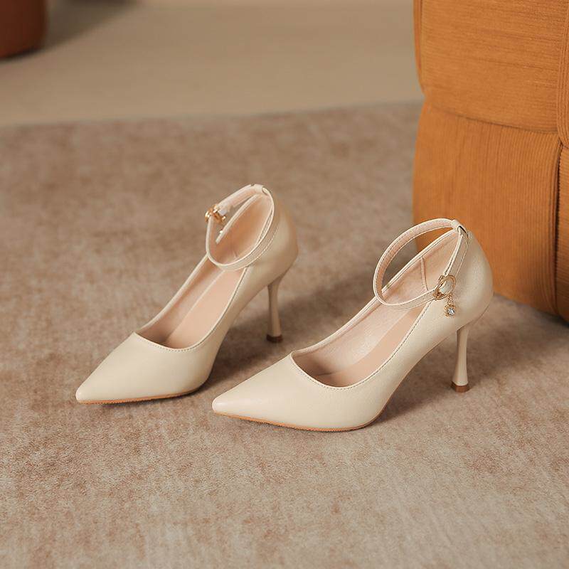 2025新款大码高跟鞋女细跟尖头宽胖脚一字扣通勤工作鞋单鞋小码鞋