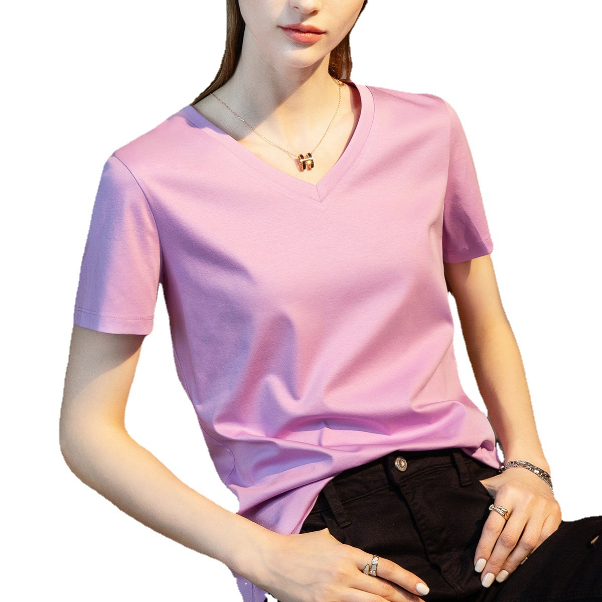 桑蚕丝真丝80支冰丝光棉高级设计感纯棉气质v领短袖女t恤2025夏季