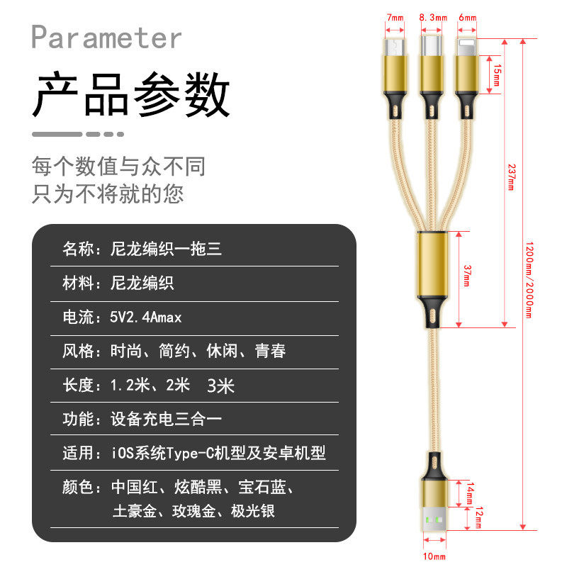 长线三合一充电器一拖三快充数据线适用苹果iPhone华为oppo小米vivo安卓通用型多头三头插座多功能插头万能冲