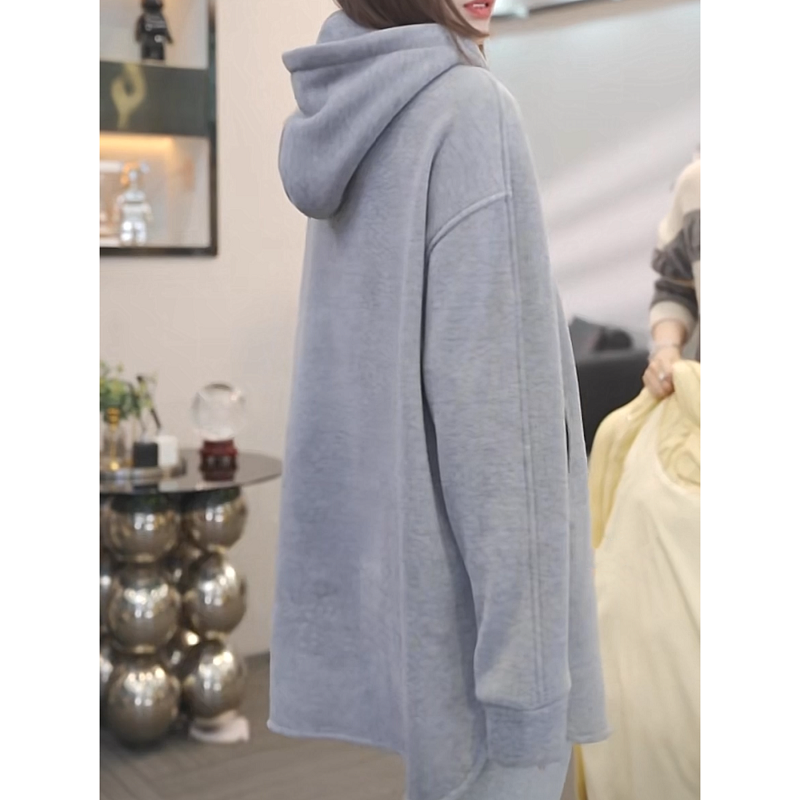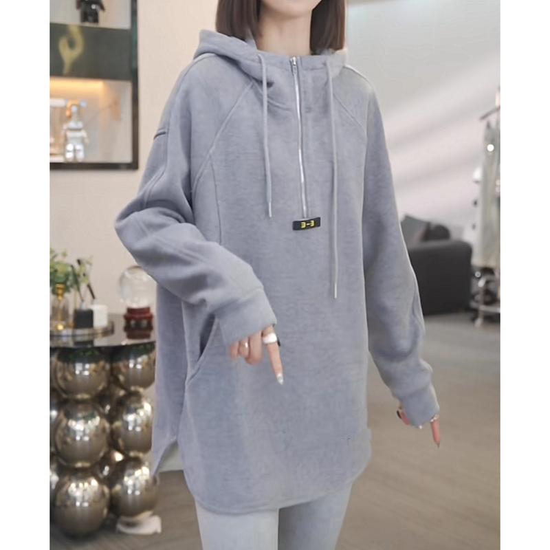 加绒加厚半拉链连帽卫衣女2025秋冬新款时尚百搭中长款上衣外套女