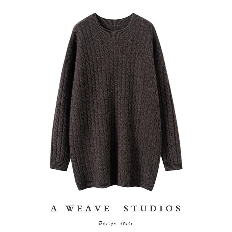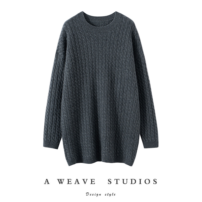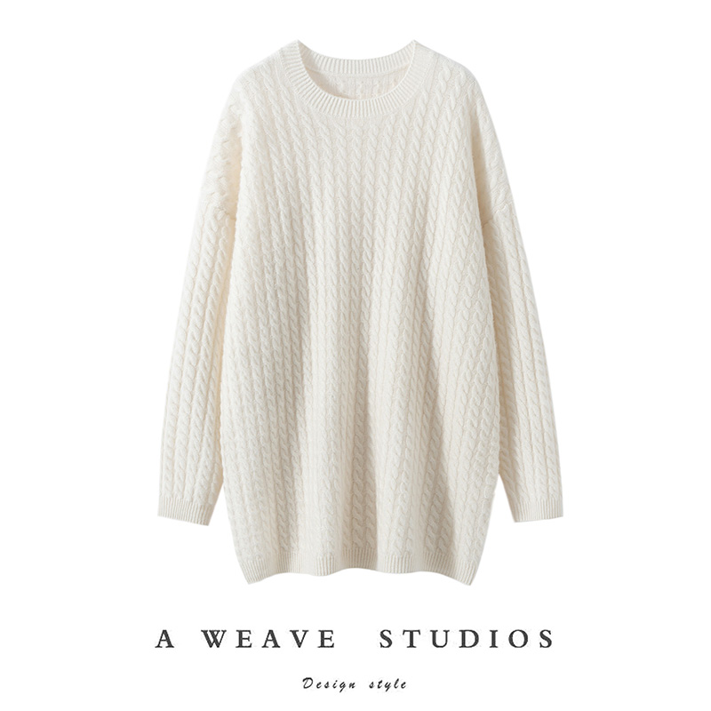 超好穿!100%纯山羊绒衫女圆领麻花毛衣宽松中长款针织打底衫上衣