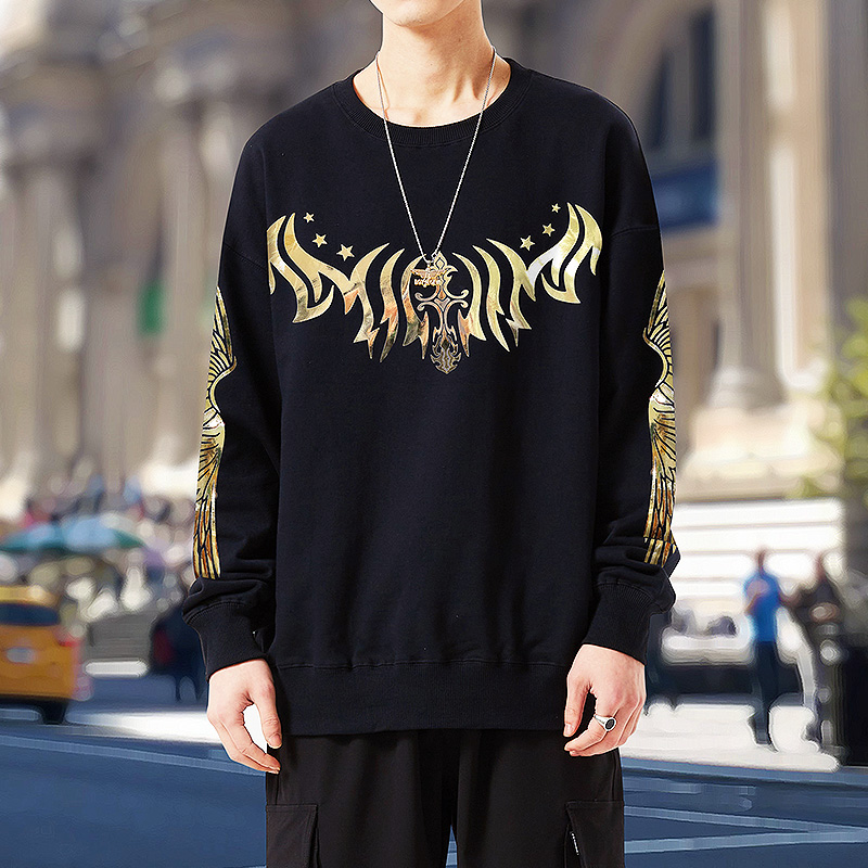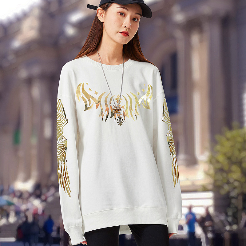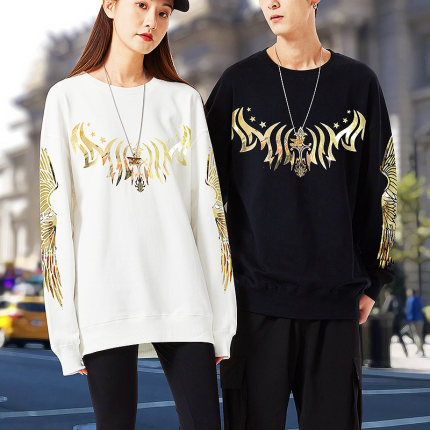 BY春季新款潮牌烫金翅膀圆领卫衣/情侣男女同款套头长袖卫衣宽松