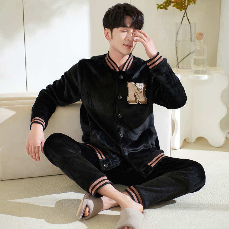 男士睡衣秋冬季珊瑚绒加厚加绒棒球服保暖法兰绒可外穿家居服套装