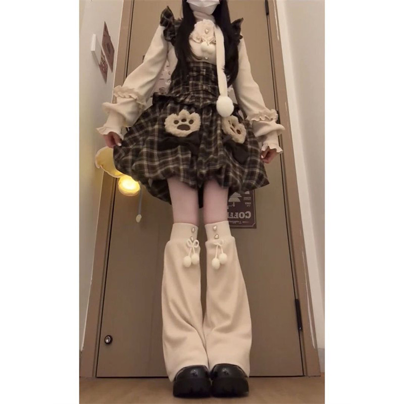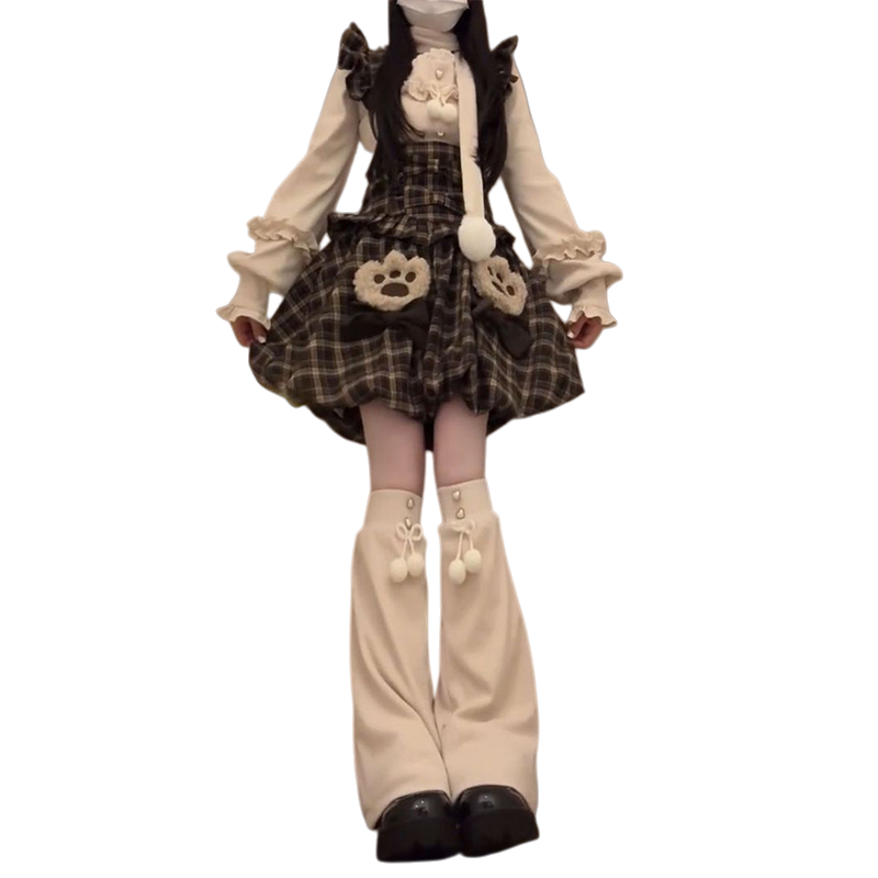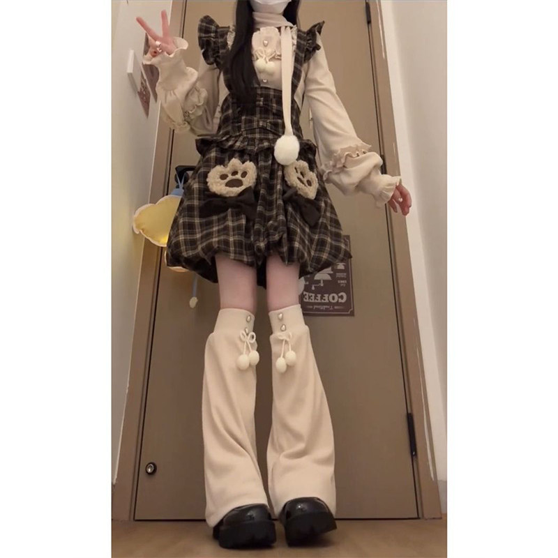 高级感复古学院风一整套穿搭格纹背带花苞连衣裙女+杏色针织上衣