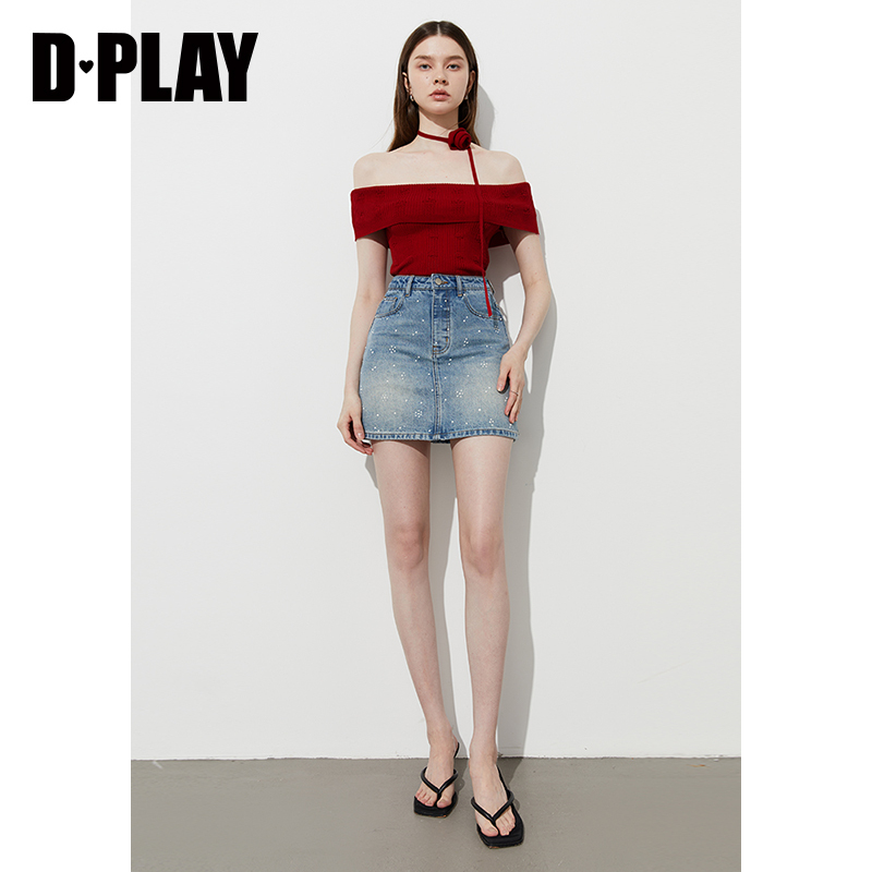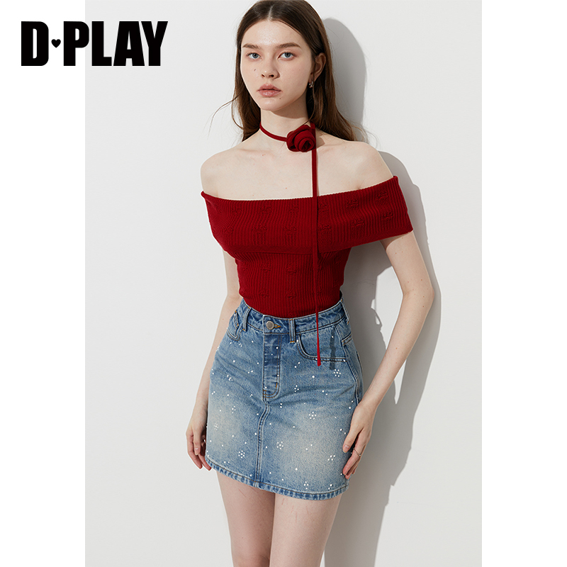 DPLAY2025年夏季新款红色上衣女莱赛尔独特一字肩修身短袖针织衫