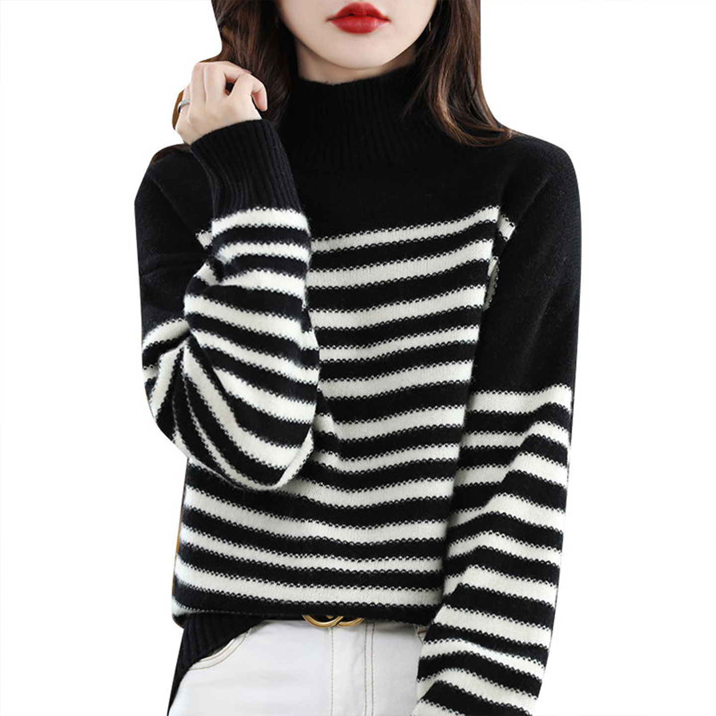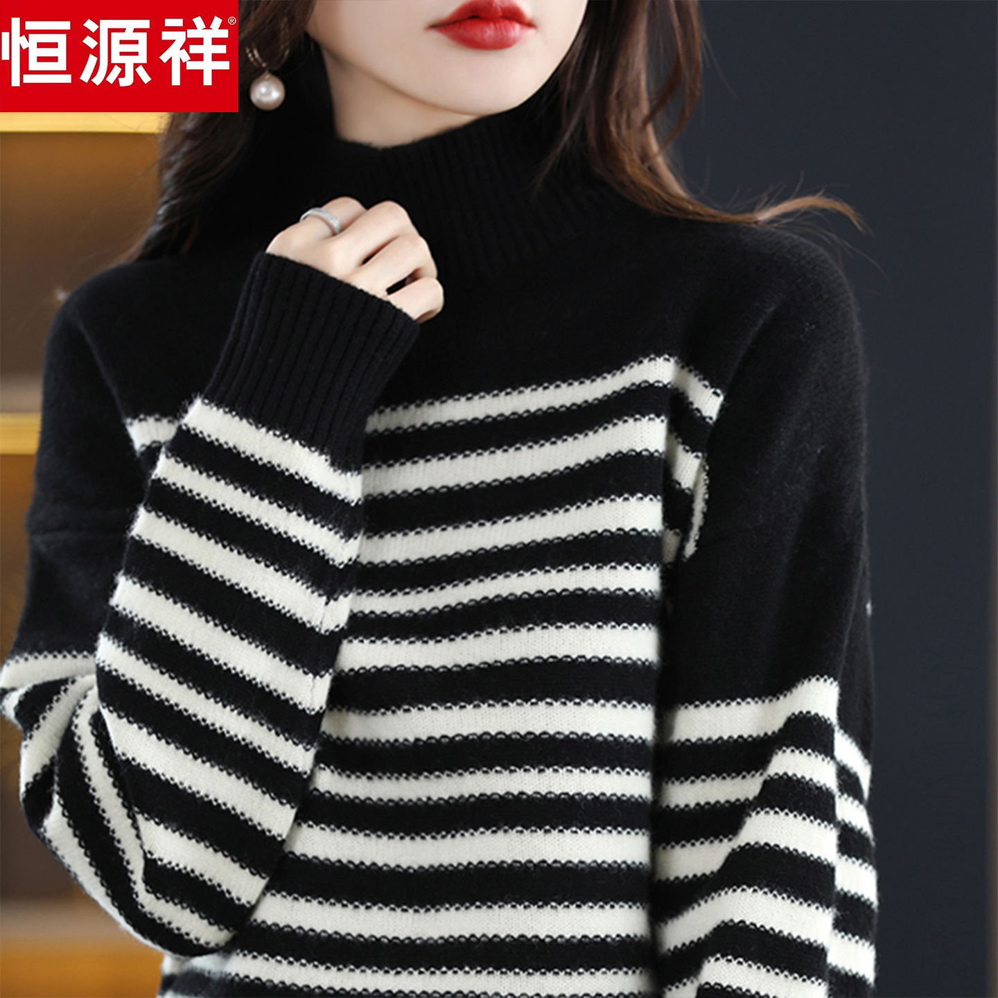 恒源祥半高领羊毛衫女秋冬宽松条纹针织打底衫外搭上衣羊绒毛衣潮