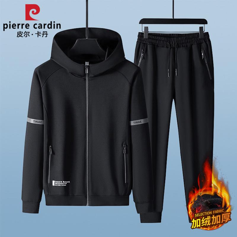 皮尔卡丹秋冬纯棉男士运动套装加绒大码中老年开衫连帽卫衣两件套
