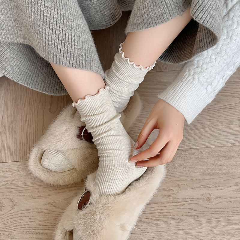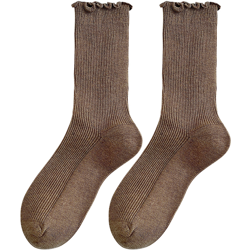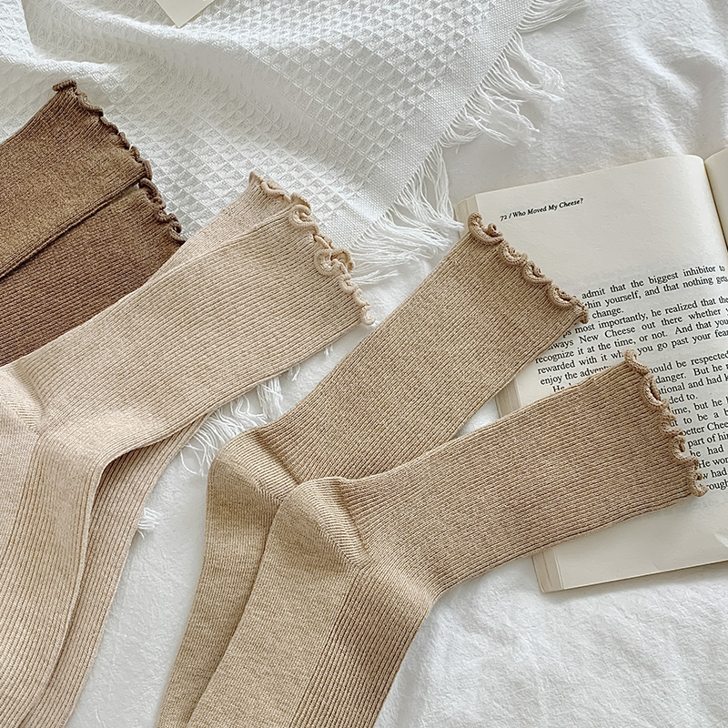 袜子女中筒袜纯棉春秋冬季森系花边卷边日系复古长筒堆堆袜咖色系