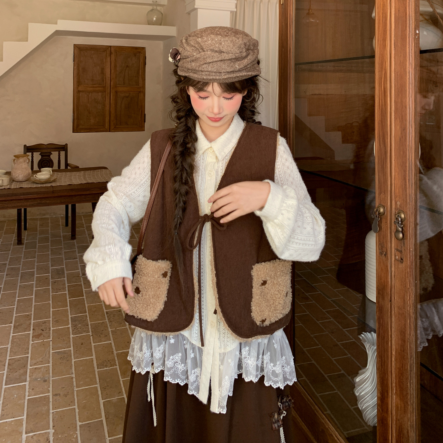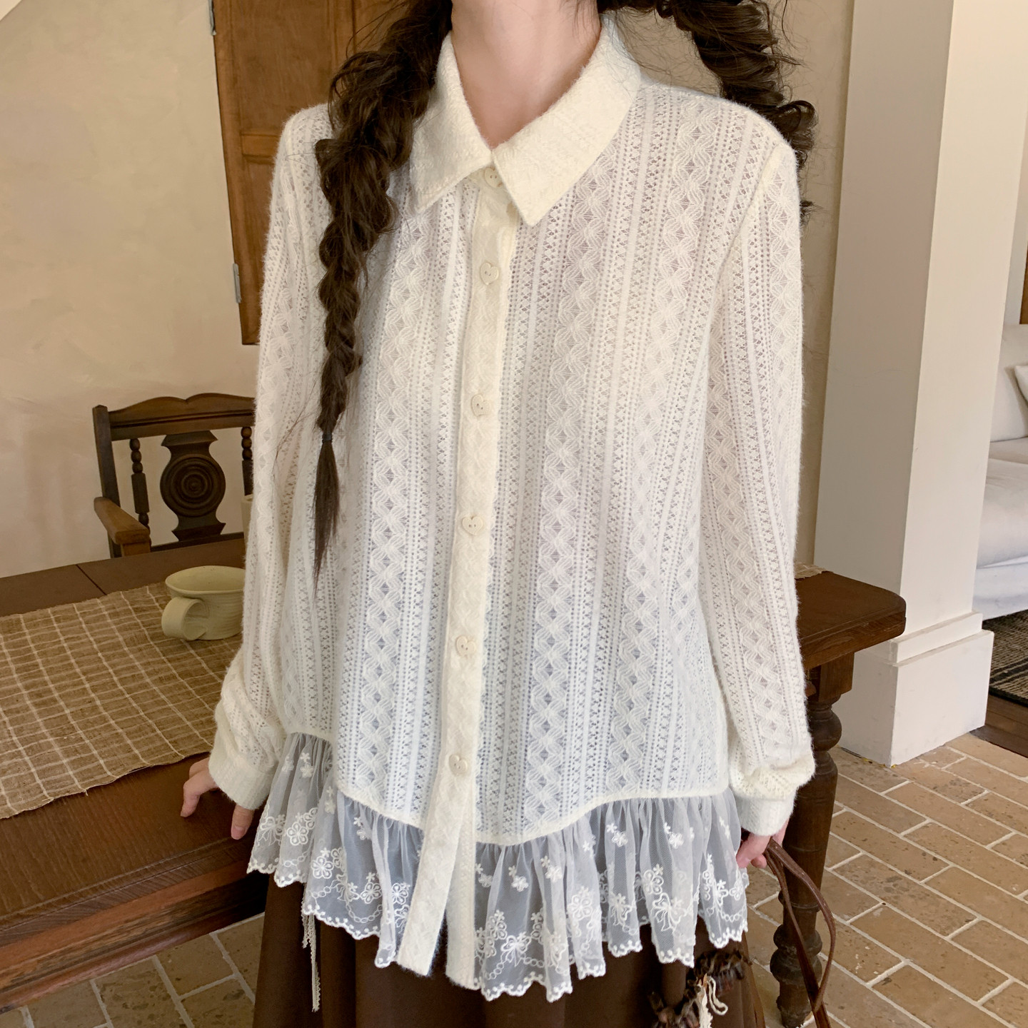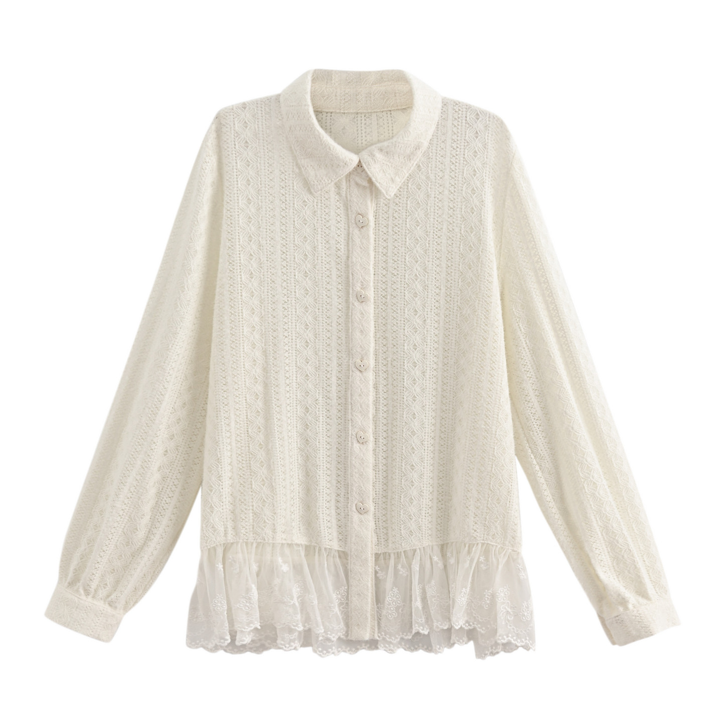 森女部落甜美设计感镂空下摆蕾丝拼接百搭显瘦上衣新款百搭衬衫女