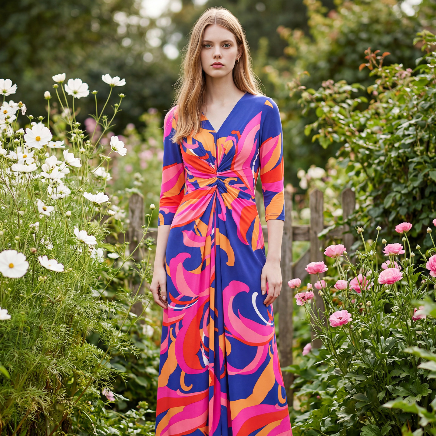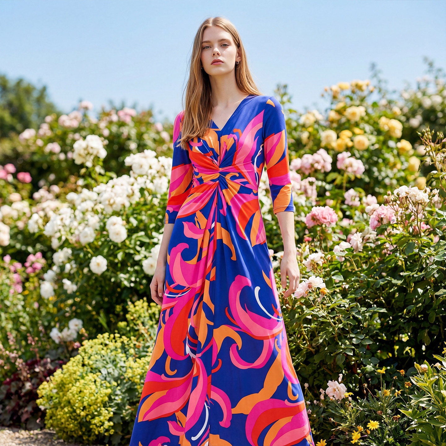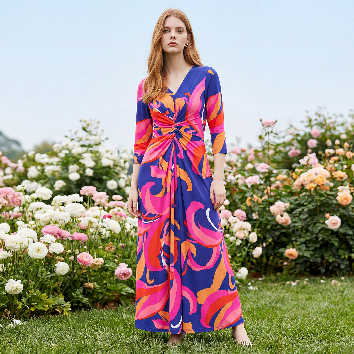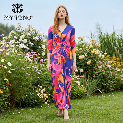 马天奴女装春夏新款红色印花连衣裙子V领捏褶收腰时尚气质度假女
