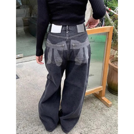 韩国chic秋冬复古减龄背后蝴蝶结印花宽松磨白阔腿裤牛仔裤长裤女