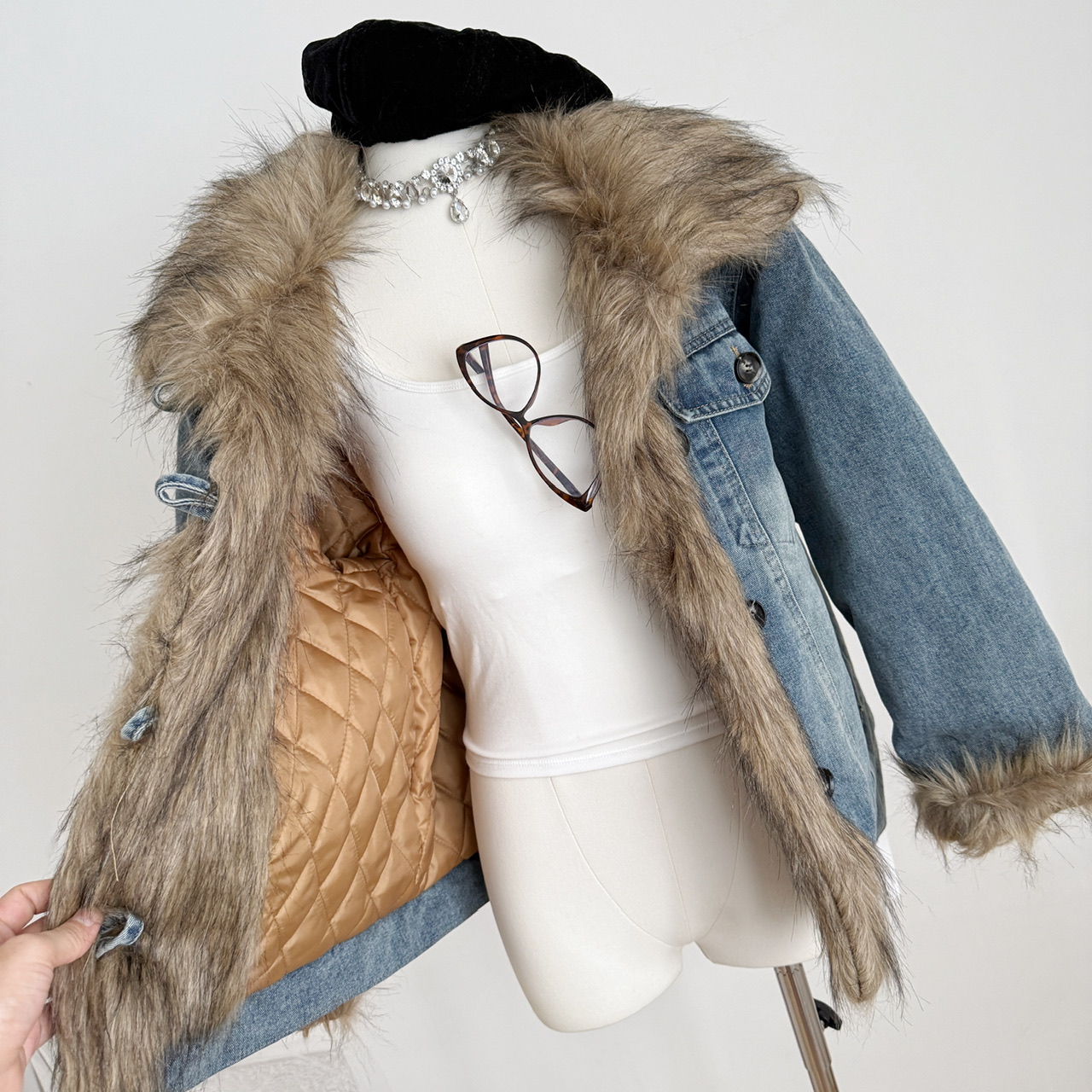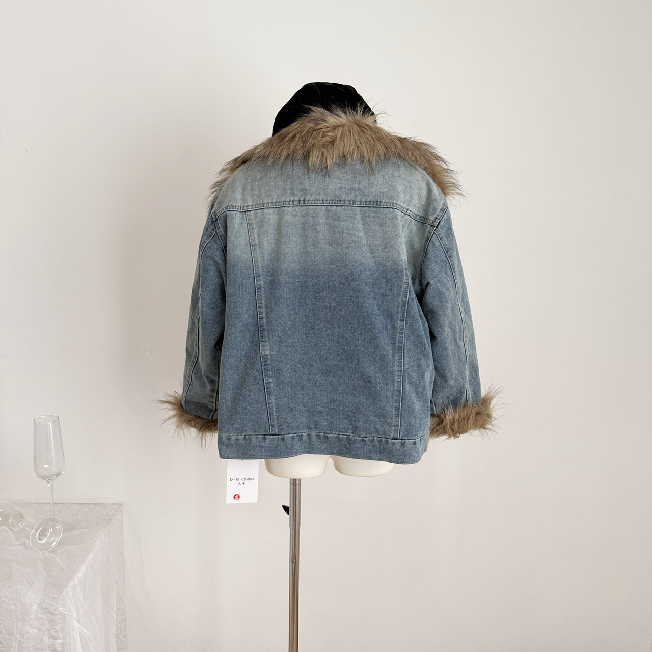 Ranwear 新一轮时髦定义 复古做旧水洗牛仔环葆皮草夹棉外套