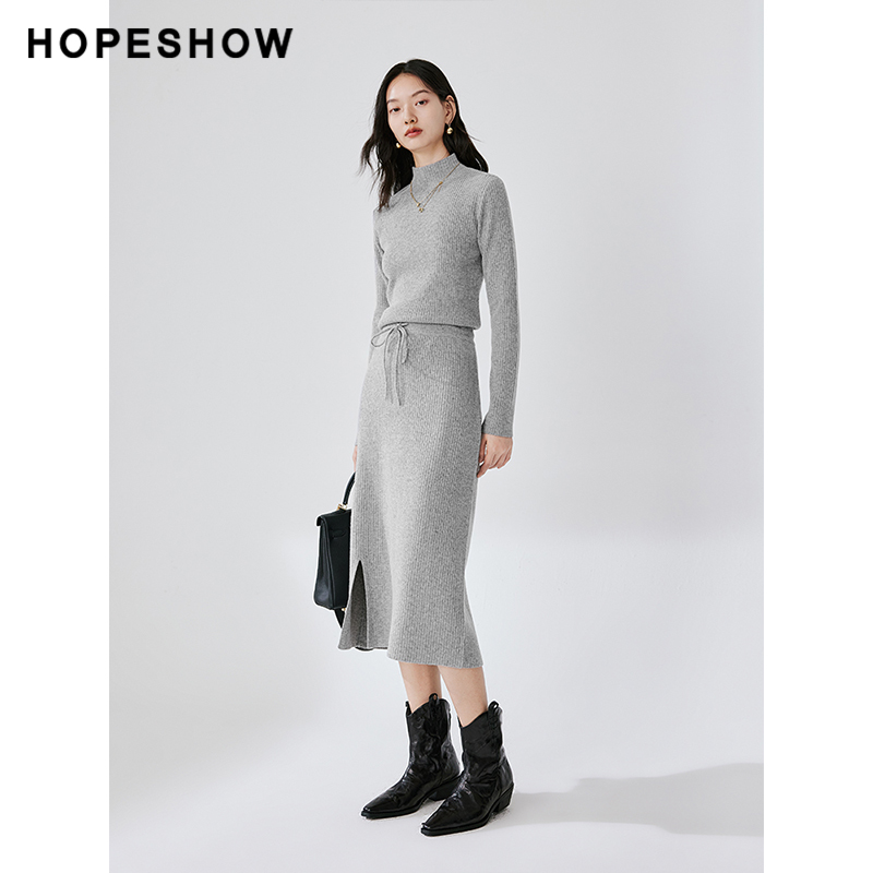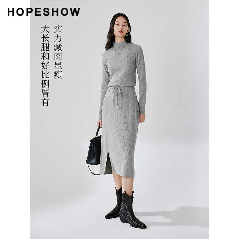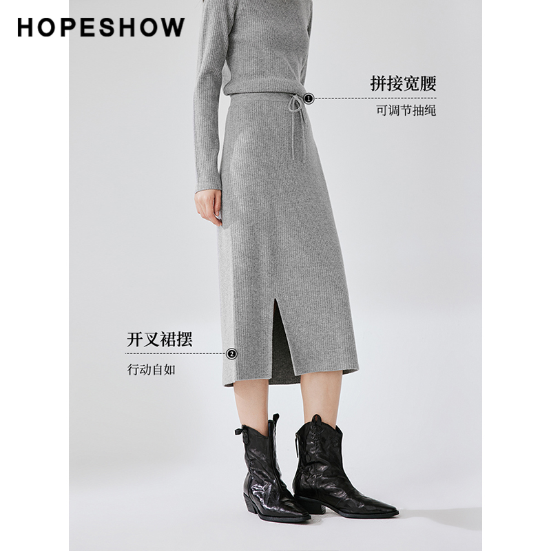 红袖冬季坑条肌理开叉直筒半身裙