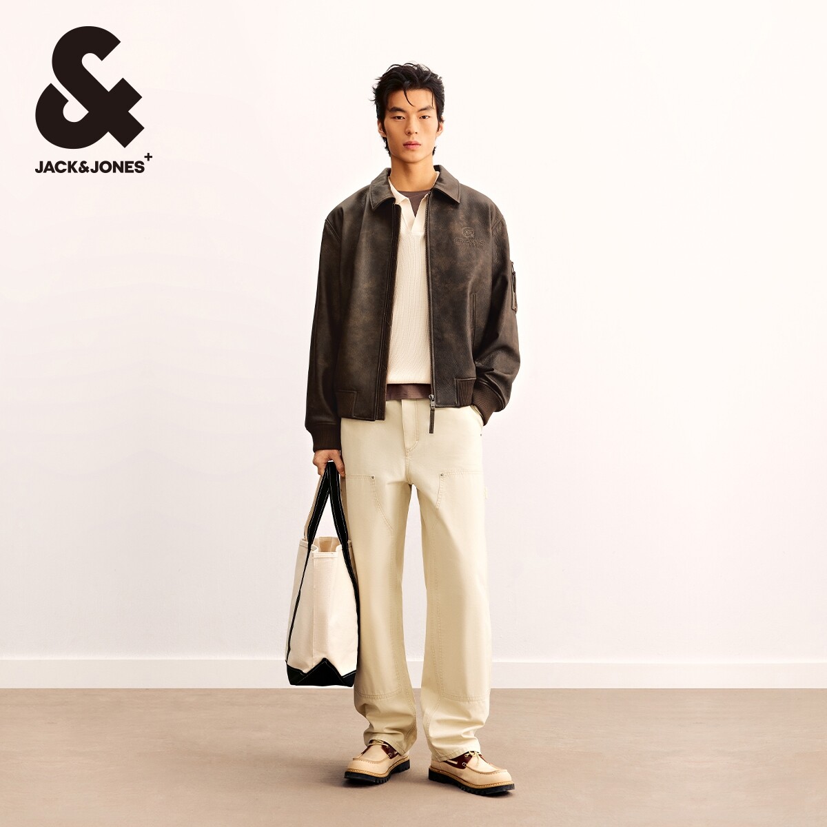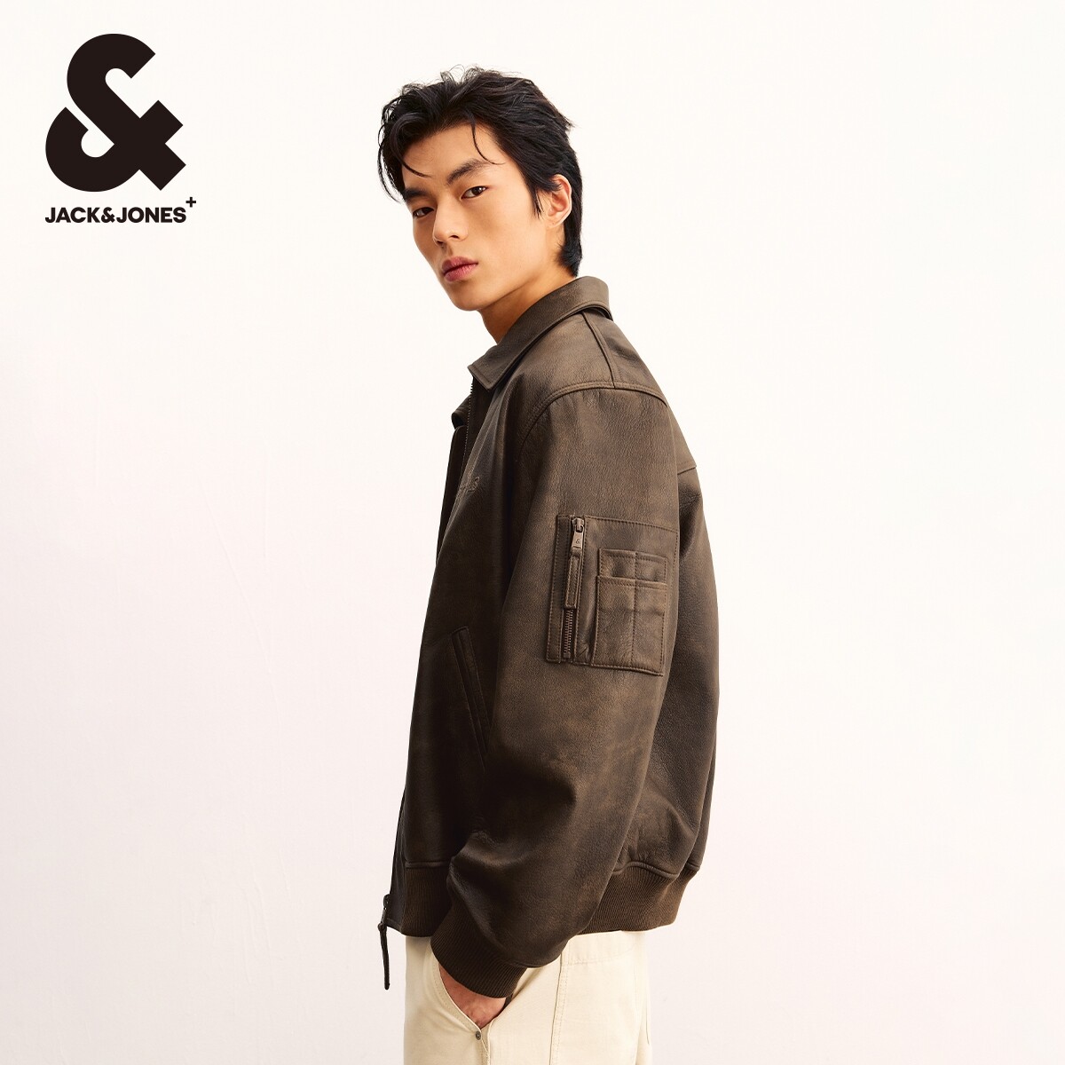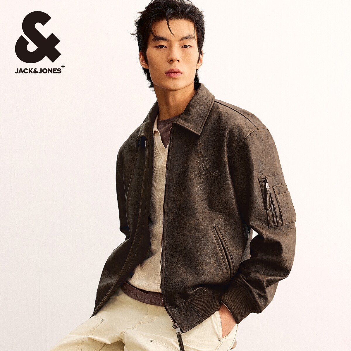 杰克琼斯男装秋季新款潮流出街百搭字母刺绣翻领宽松真皮夹克外套