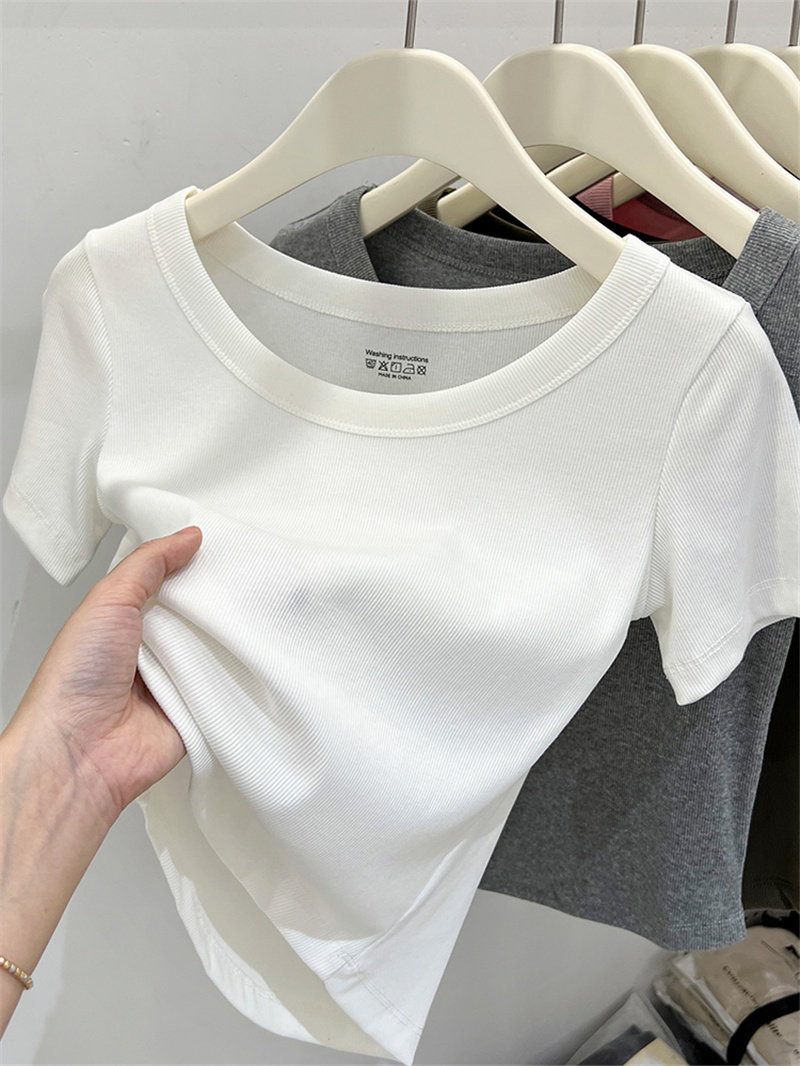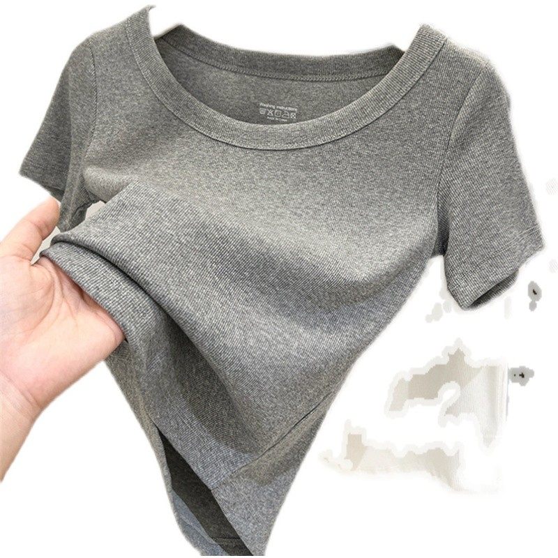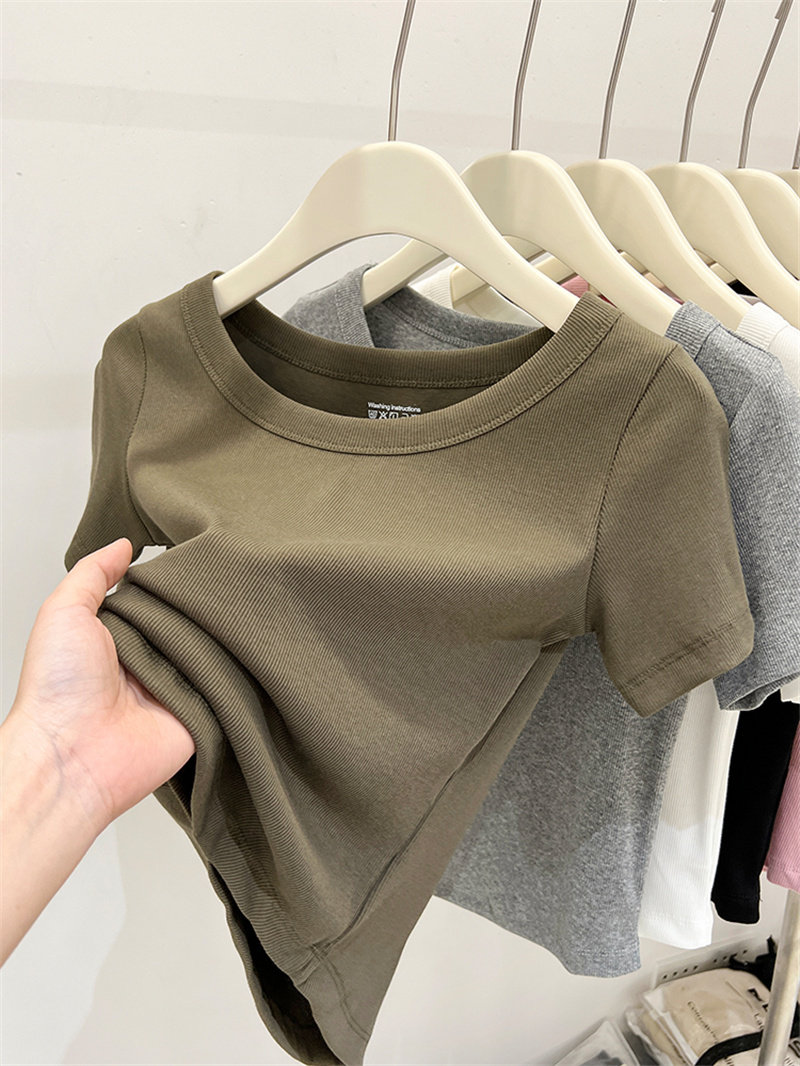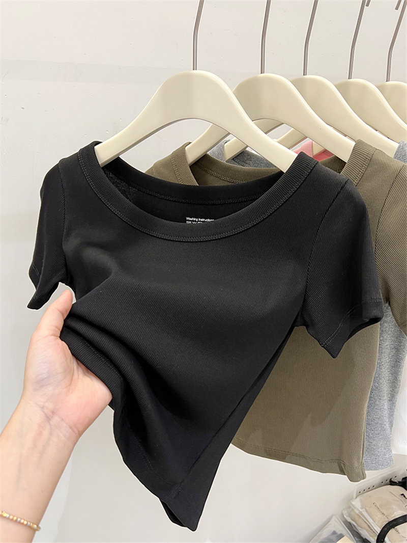 螺纹短袖t恤女夏季2023新款时髦时尚露锁骨小众修身短款上衣女潮