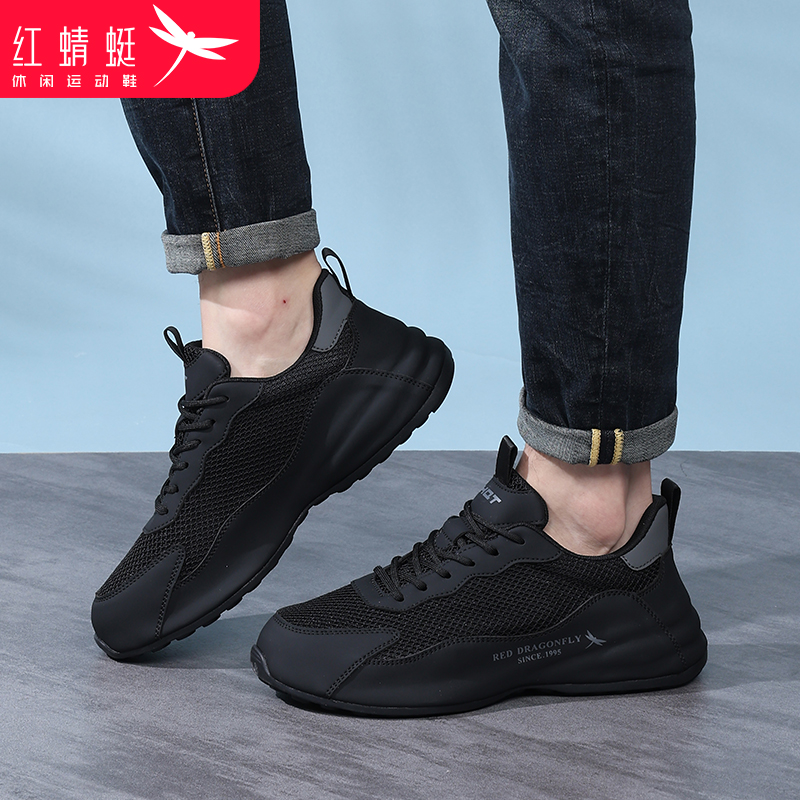 红蜻蜓飞织透气鞋子男厚底增高防臭黑色休闲运动鞋轻便舒适旅游鞋