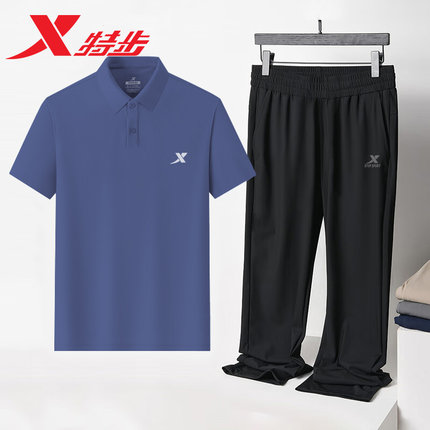 特步男士休闲套装2025冬季透气速干POLO衫时尚长裤中老年运动装男