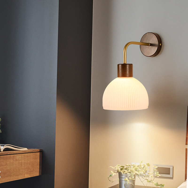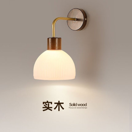 床头壁灯胡桃木色新中式实木卧室现代民宿过道玻璃壁灯具壁挂式