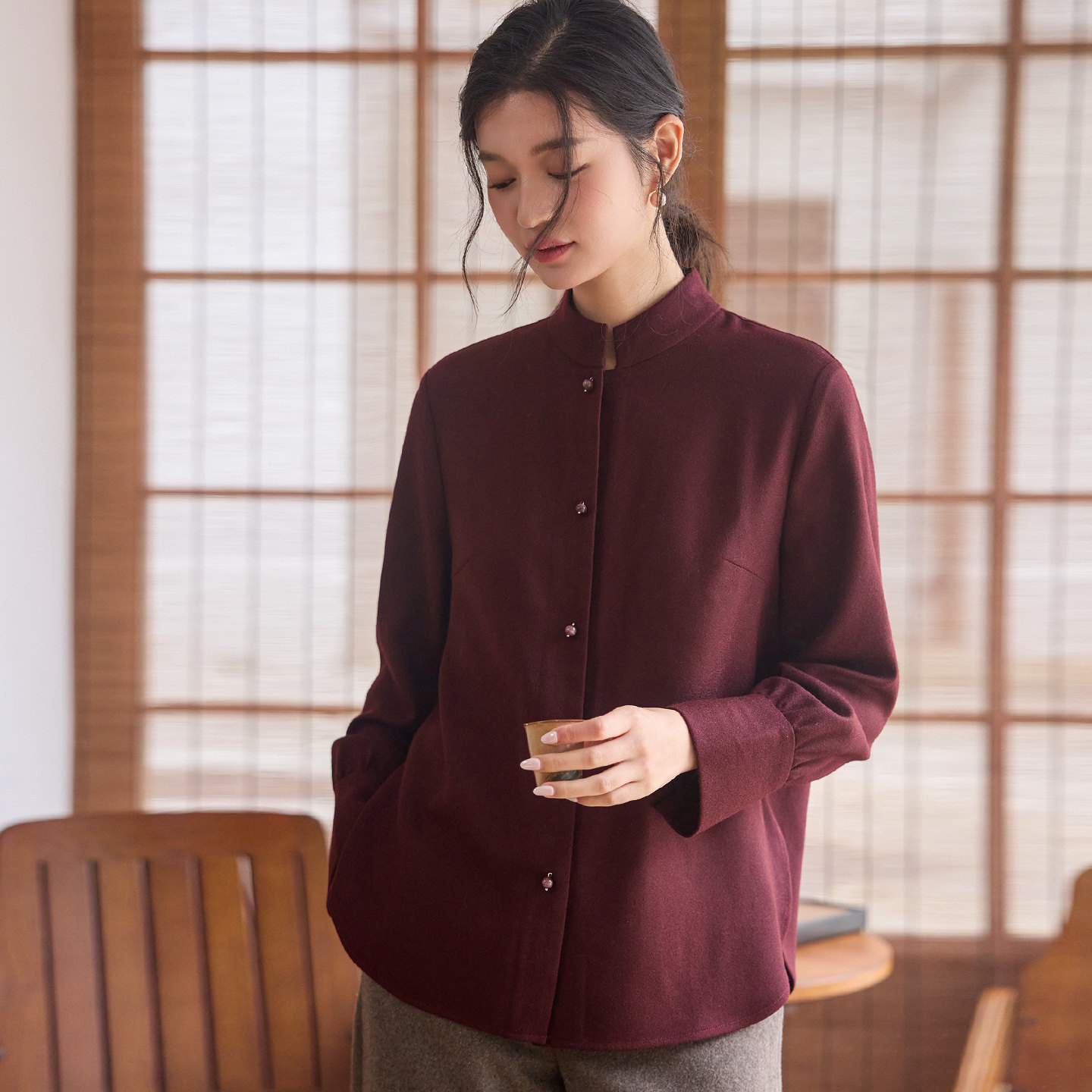 菲伊唐冬精细羊毛棉衬衣新中式复古改良唐装女上衣女内搭打底衬衫