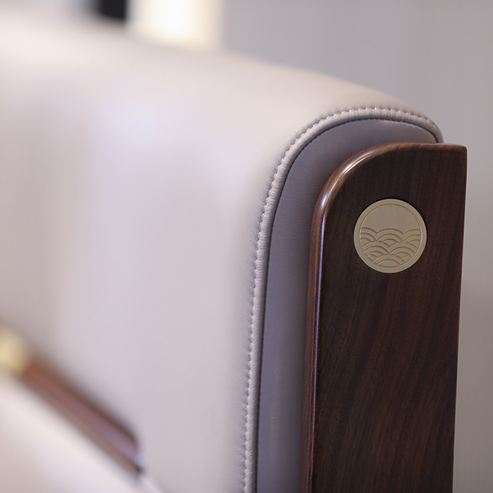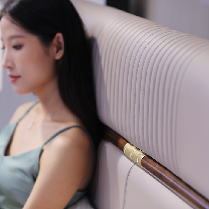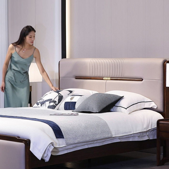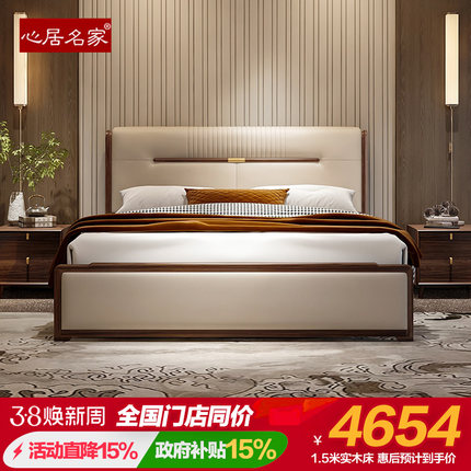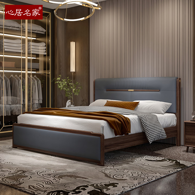 心居名家新中式实木双人床高档卧室家具进口乌金木头层真皮软靠包