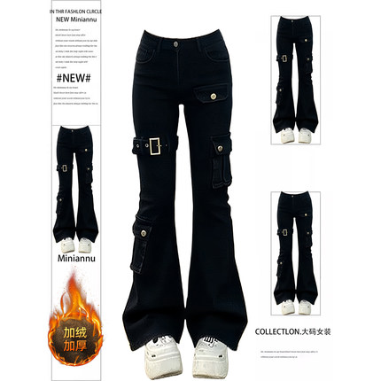 300斤大码女装黑色弹力加绒牛仔裤女胖mm复古工装风加厚微喇裤子