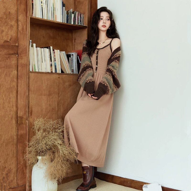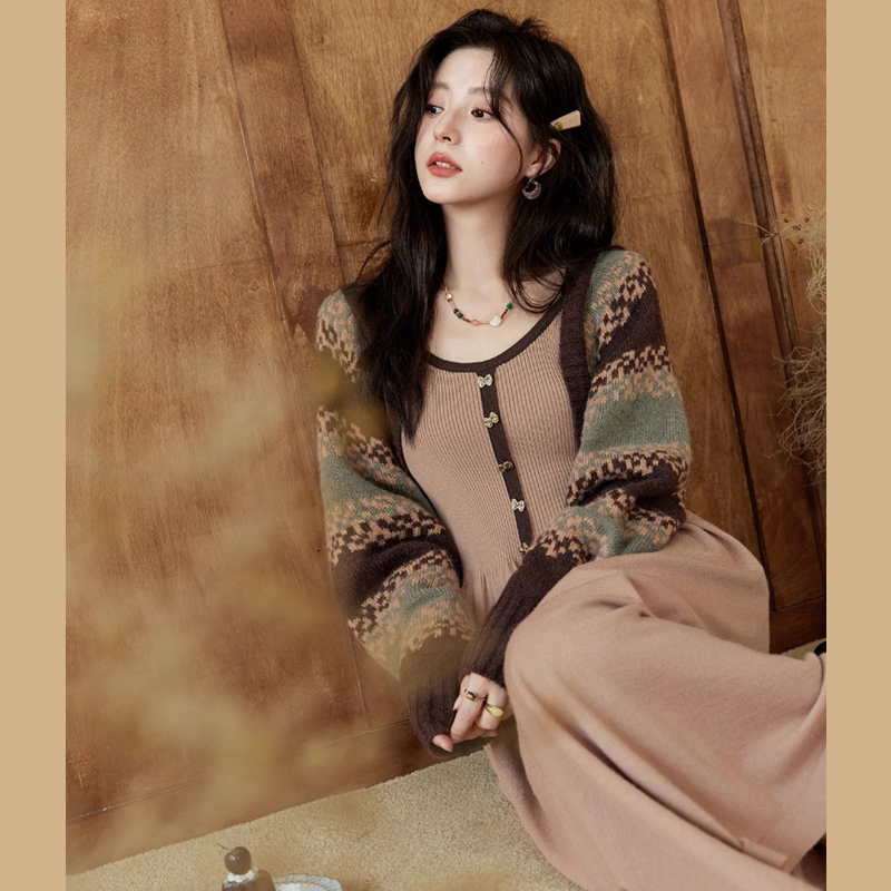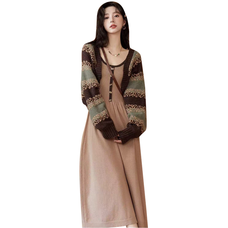 小香风孕妇秋冬连衣裙套装2025新款复古撞色毛衣外套气质吊带裙子