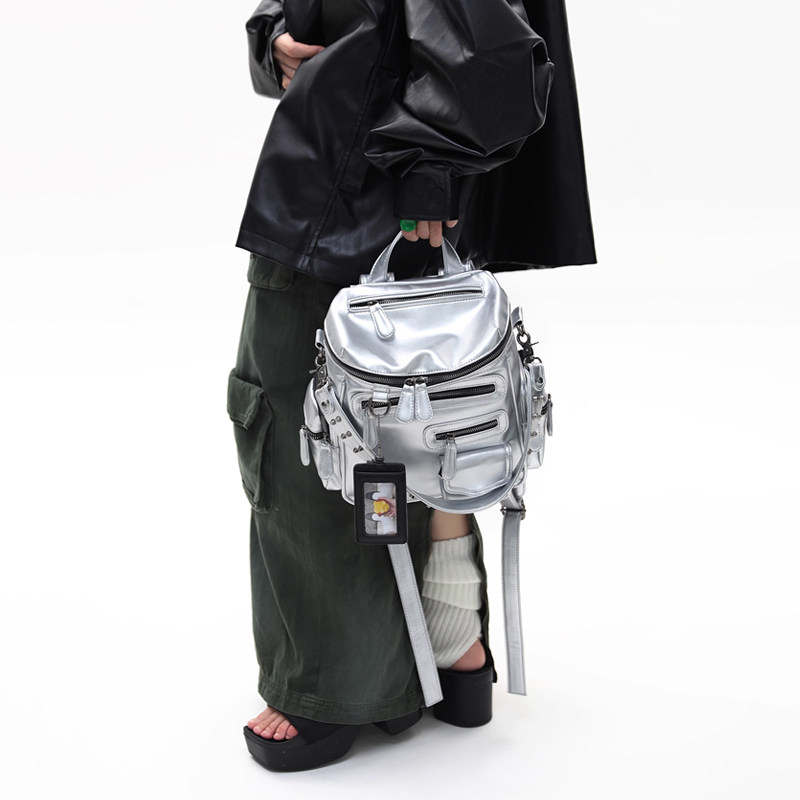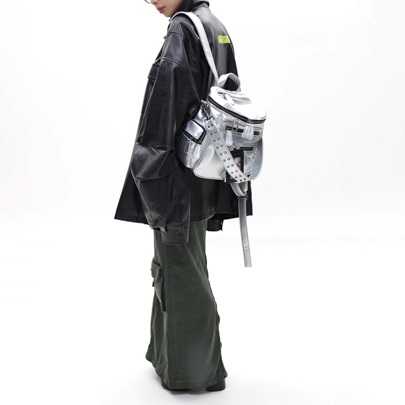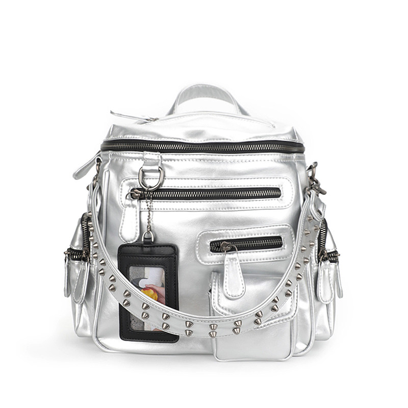 简着 /原创 小号里斯林肯银色 多口袋拉链辣妹铆钉机车单肩双肩包