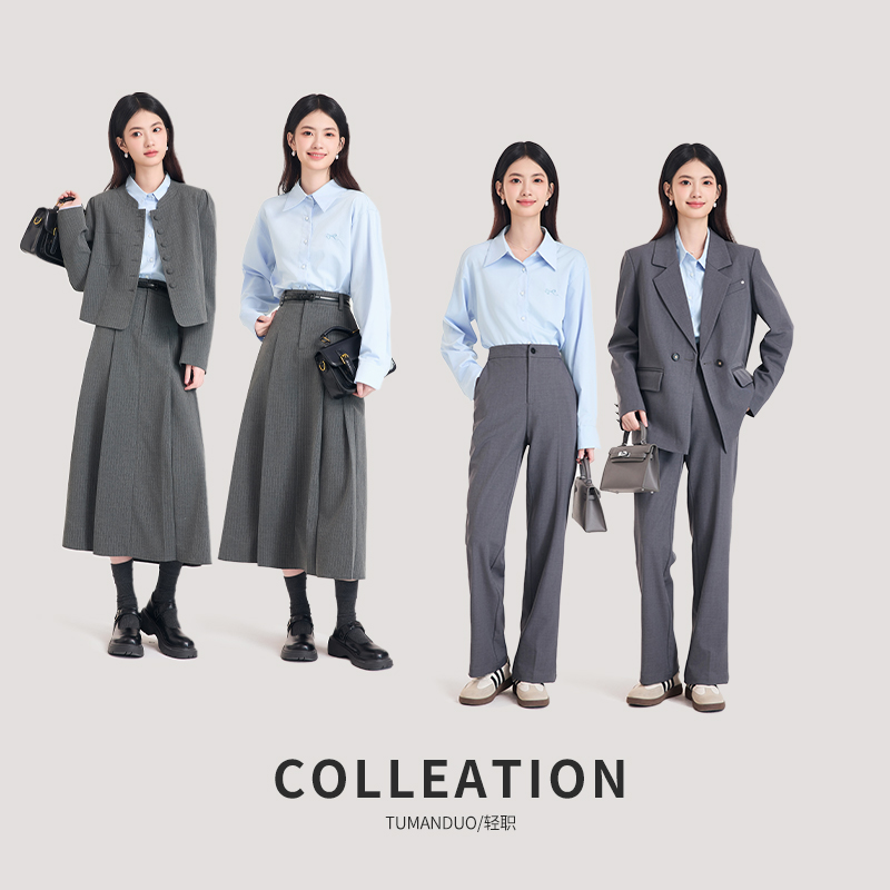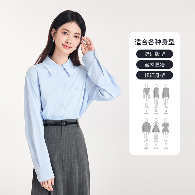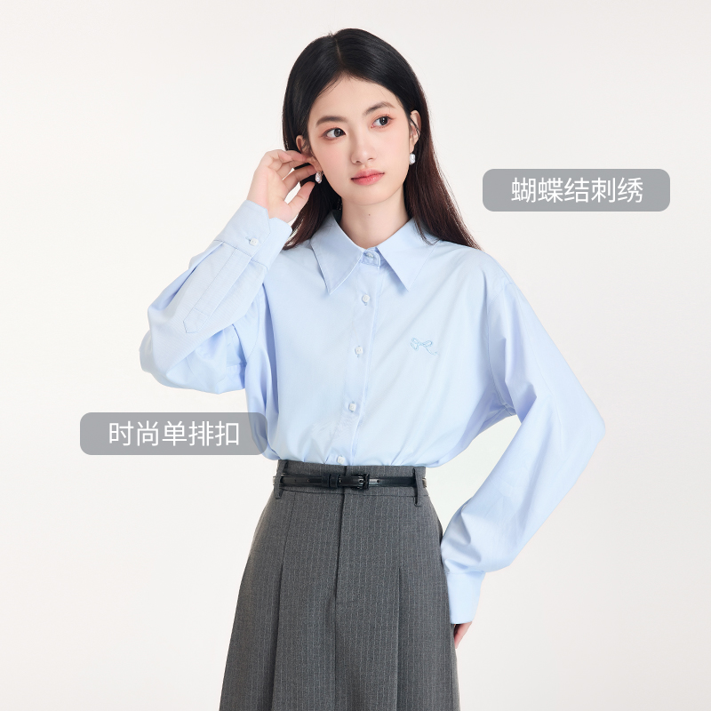 图曼朵蓝色长袖衬衫女早秋学院风减龄衬衣高级感面试通勤穿搭上衣