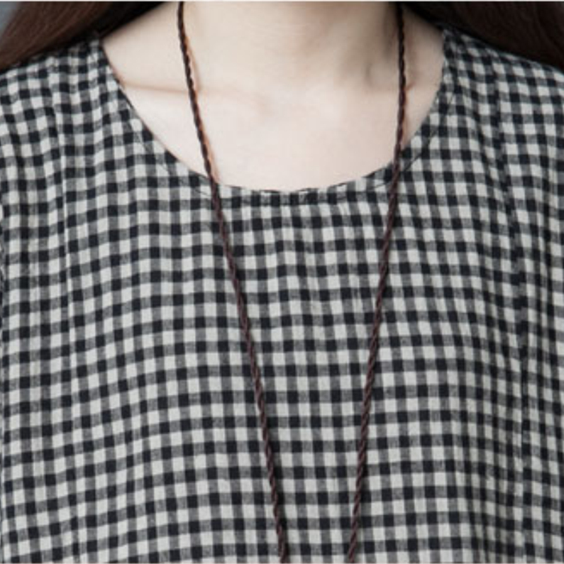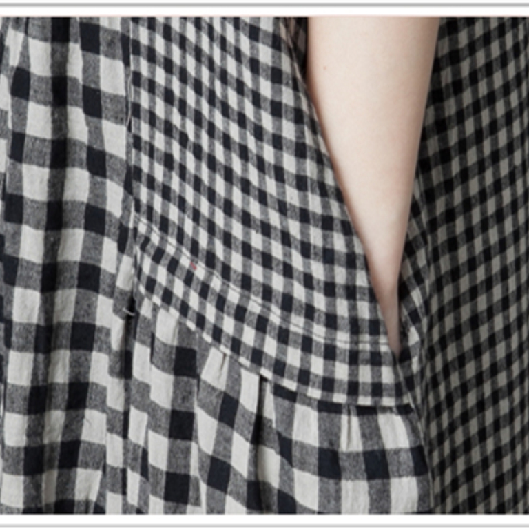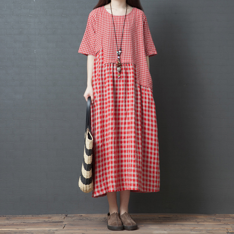折扣夏季新款韩版宽松大码女装时尚不规则拼接棉麻格子短袖连衣裙