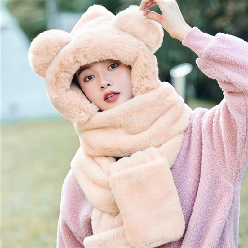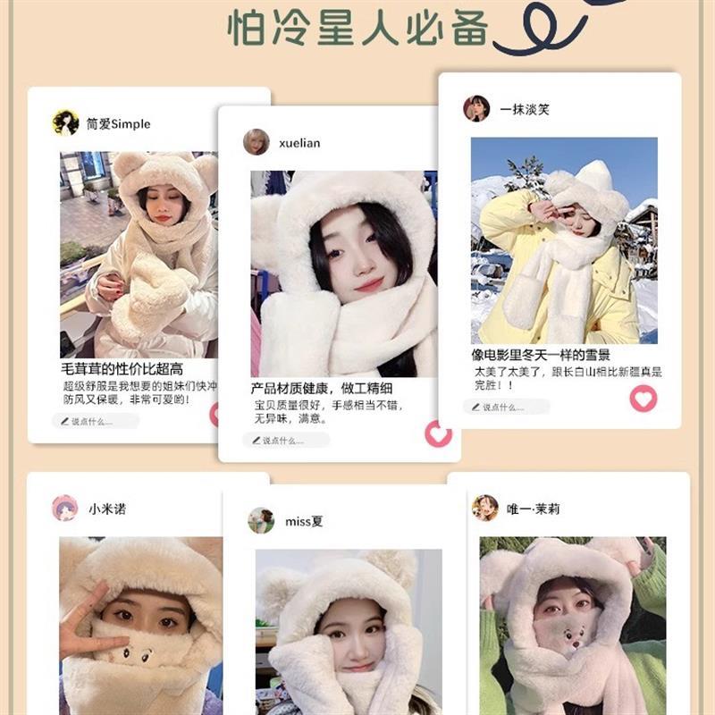 小熊帽子女秋冬围巾手套一体连帽冬季围脖保暖可爱毛绒冬天三件套