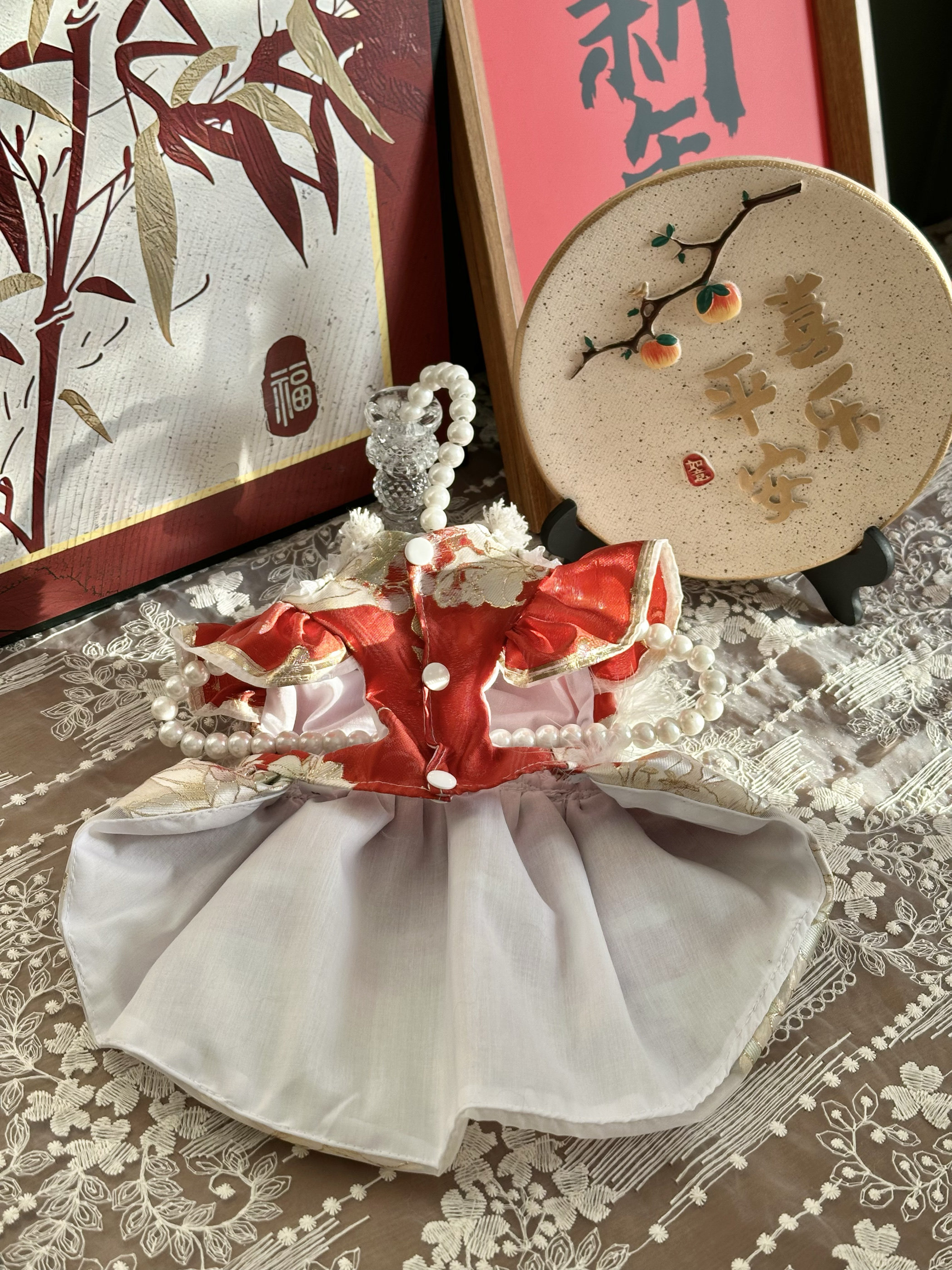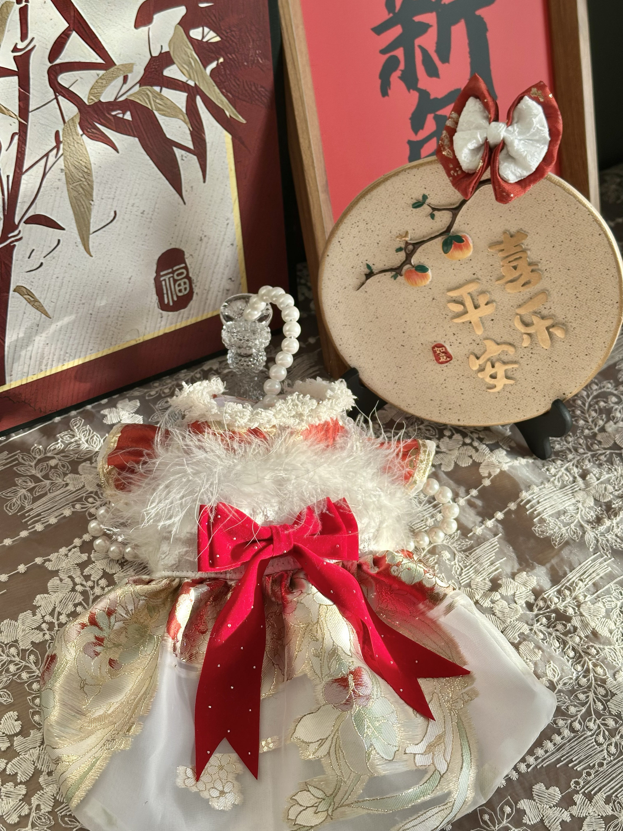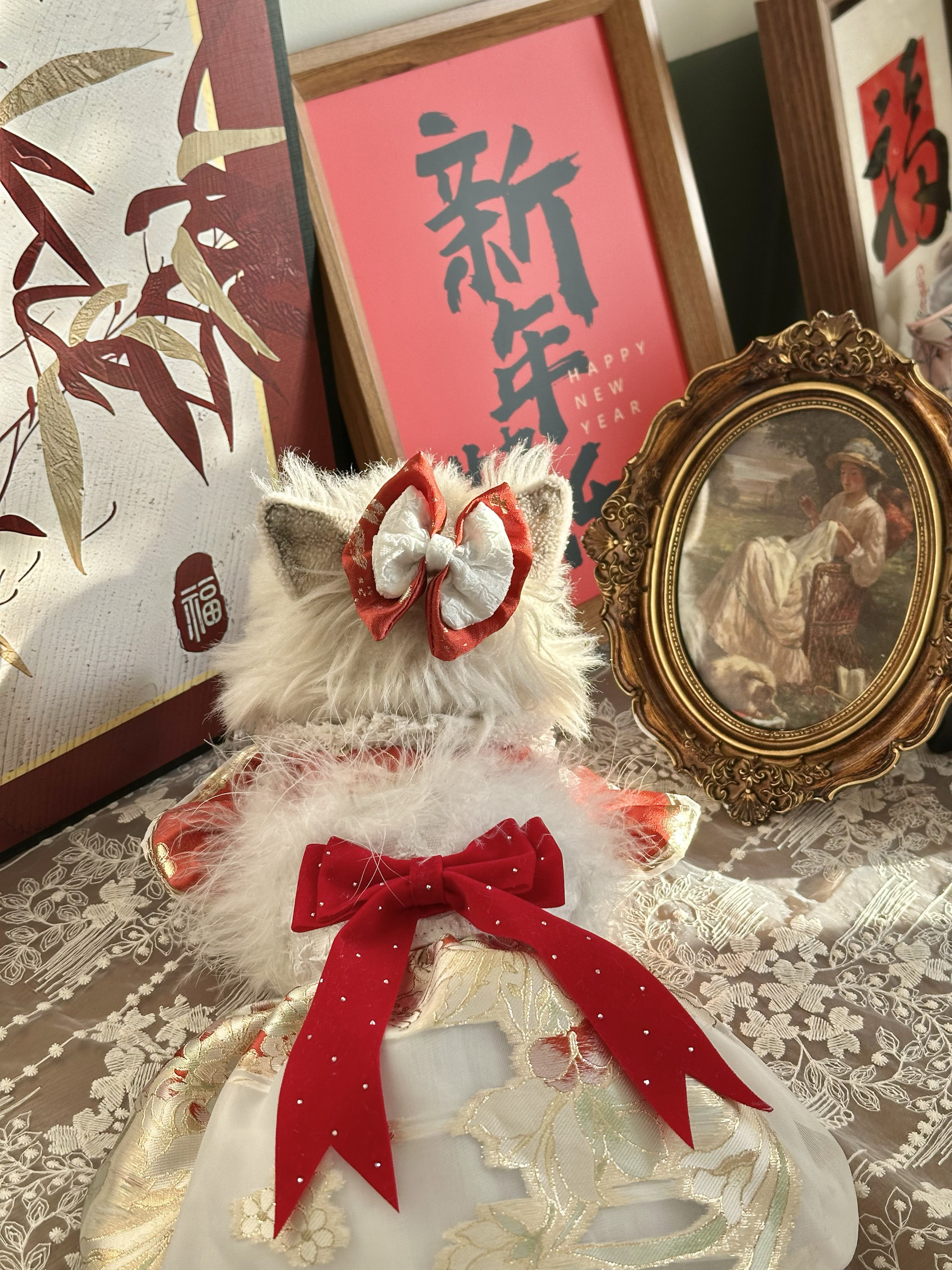AW手工高定拜年礼服款猫咪精致植绒烫金柯基泰迪羽毛缎面华丽外出