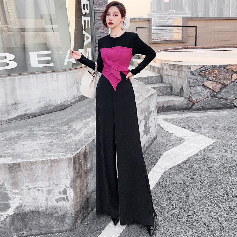 春装长袖时尚拼色气质显瘦高腰垂坠感阔腿长裤收腰连体裤女加长裤