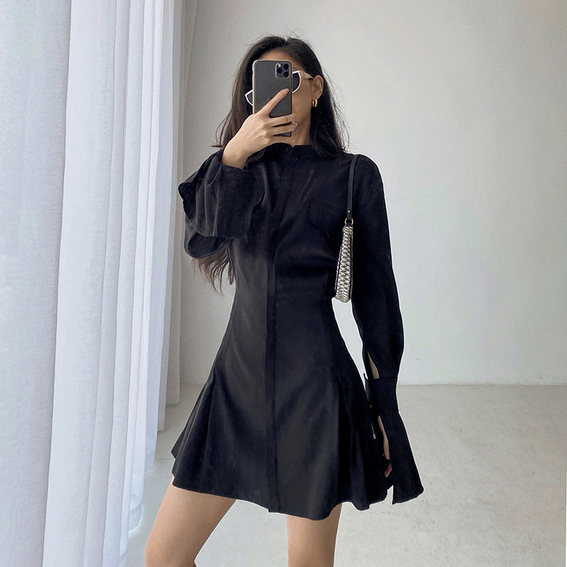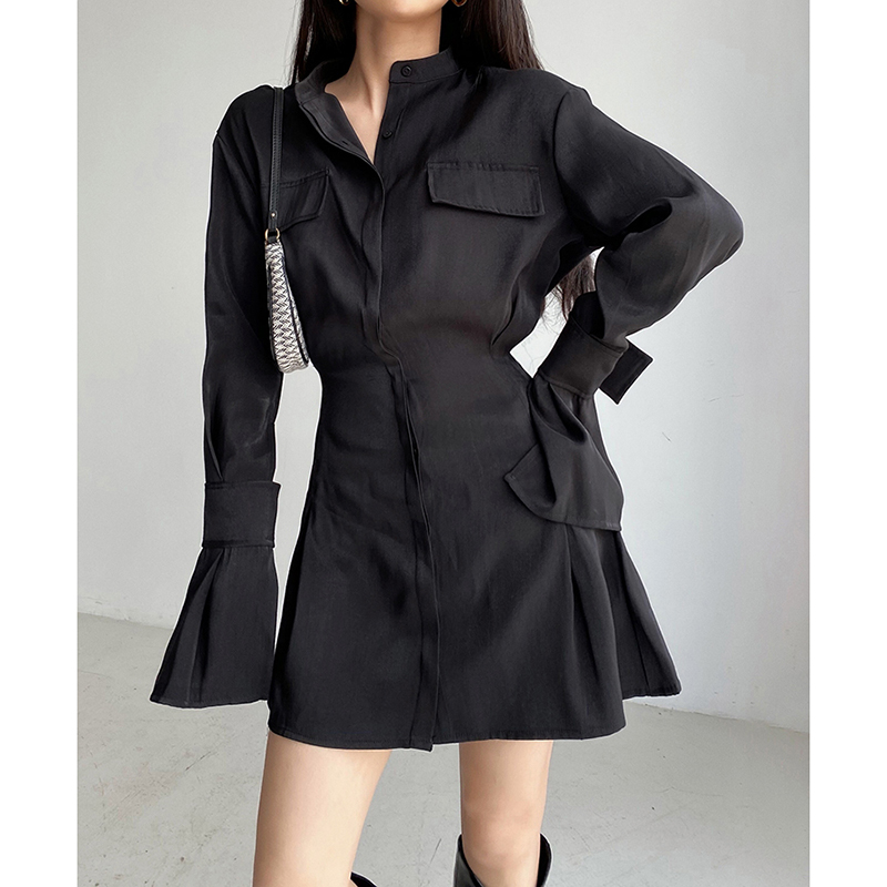 春秋学院风衬衣连衣裙小个子喇叭长袖缎面a字显瘦衬衫垂感短裙子