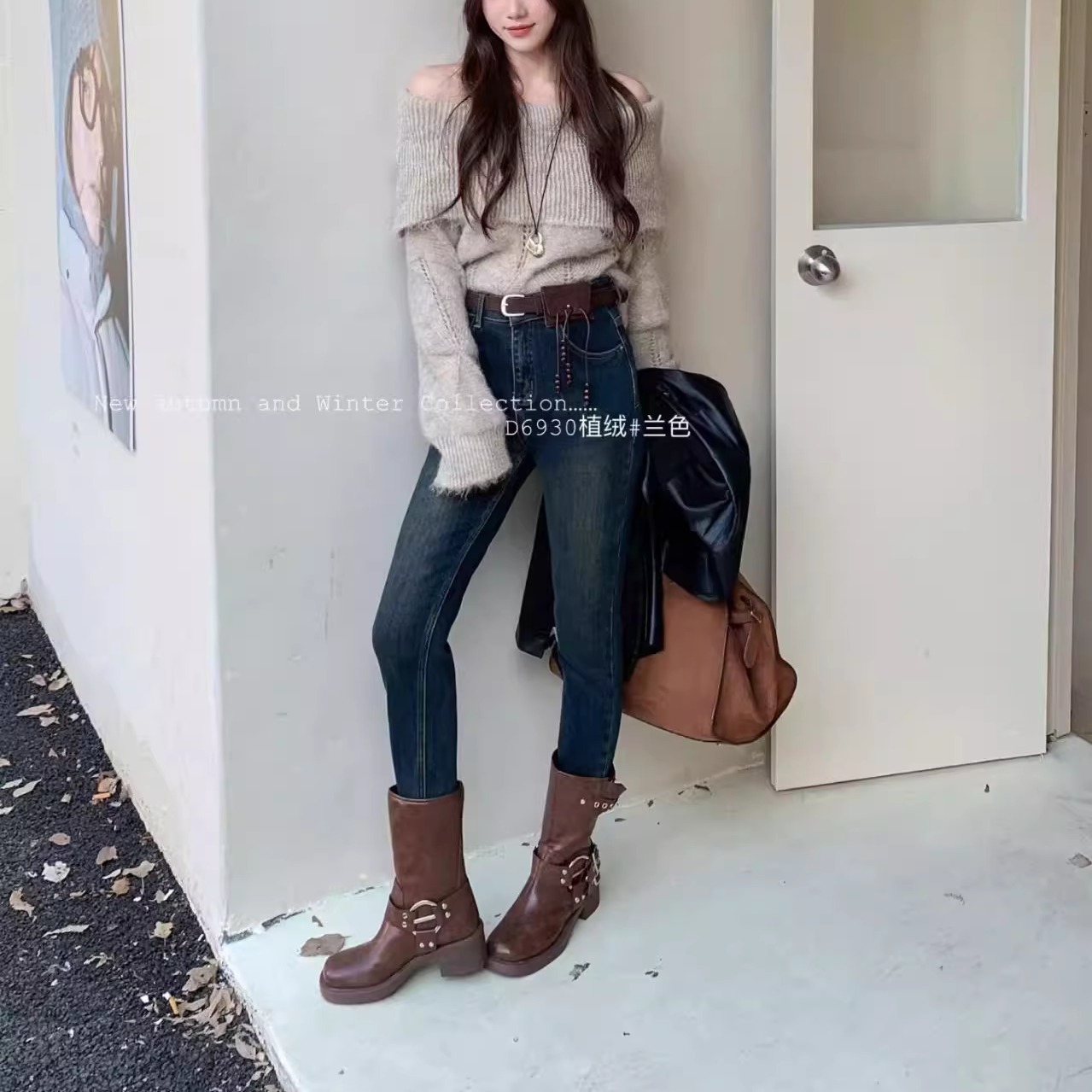 柔柔家牛仔裤女秋季植绒高腰显瘦小脚裤修身弹力九分铅笔裤D6930