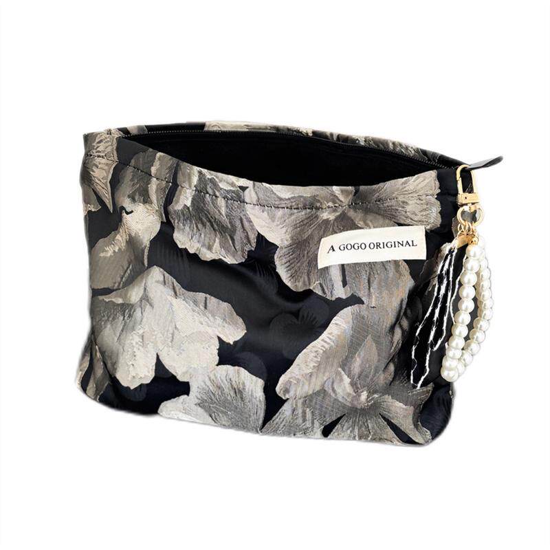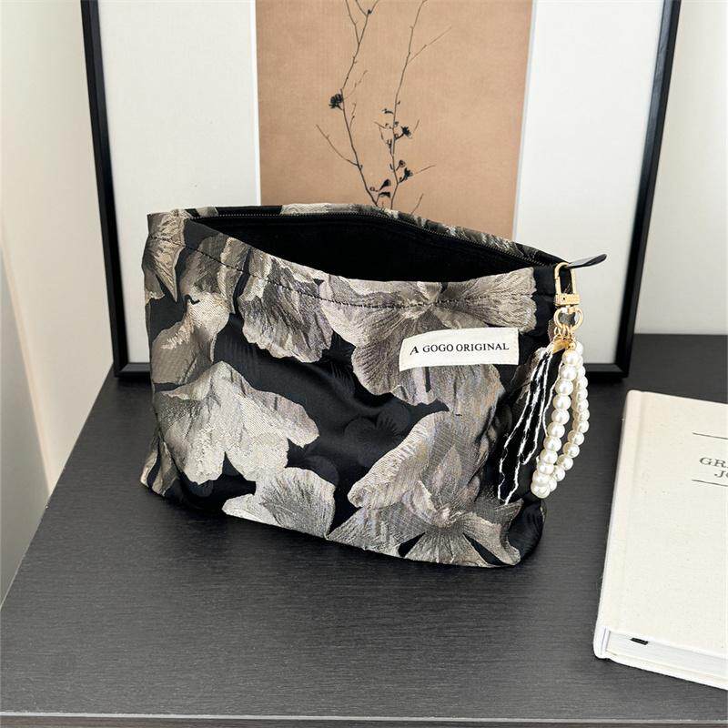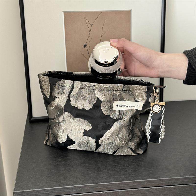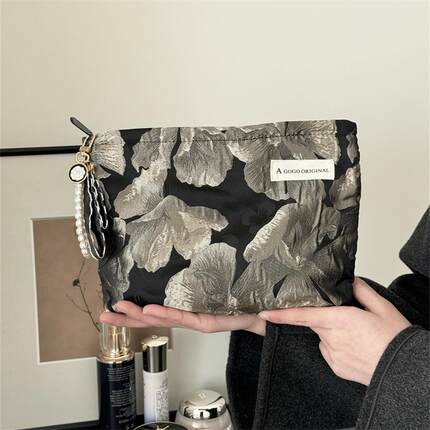 高级感黑色花朵化妆包文艺黑色内胆包旅行便携洗漱包小方包手拿包