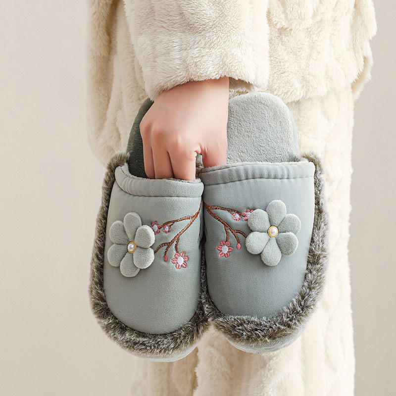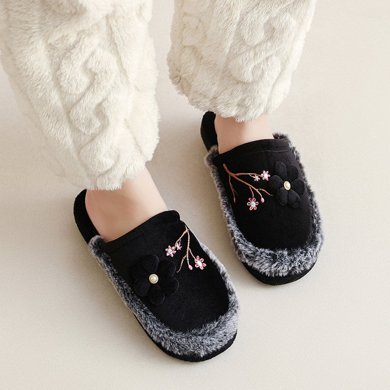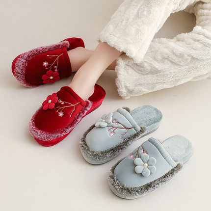 国风刺绣优雅坡跟棉拖鞋防滑