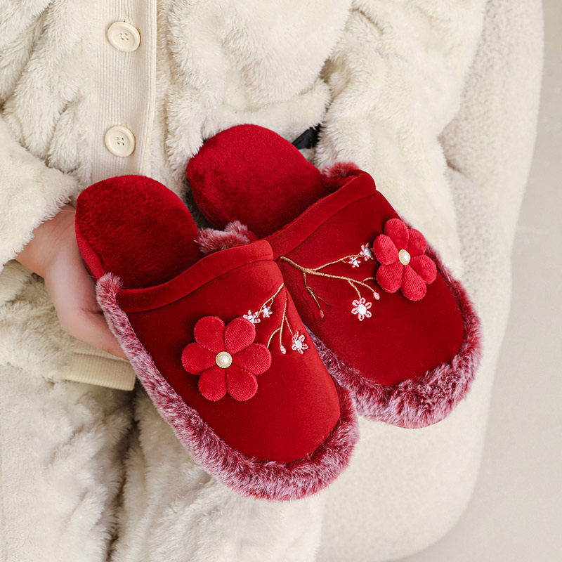 清库!国风绣花梅花家用坡跟棉拖鞋女软底厚底防滑保暖居家鞋秋冬