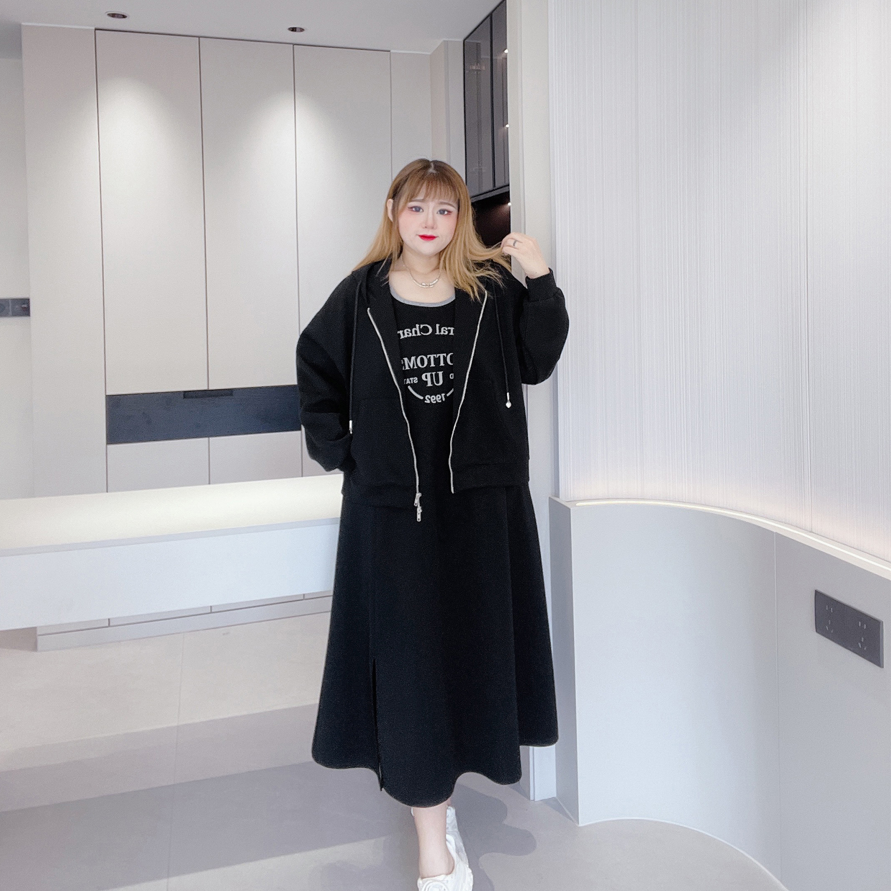 胖仙女莹莹大码女装胖MM秋休闲遮肉连帽卫衣开叉背心连衣裙套装女