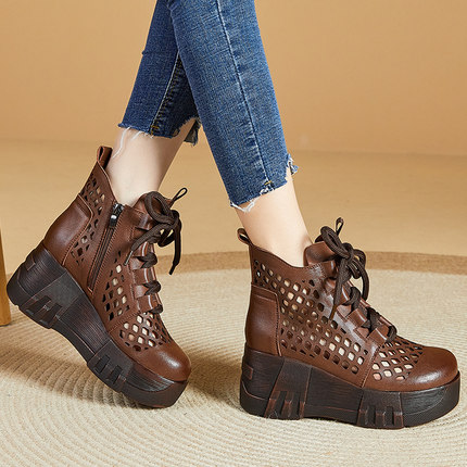 真皮复古凉靴女新款镂空高跟女鞋春夏坡跟厚底洞洞鞋松糕软底凉鞋