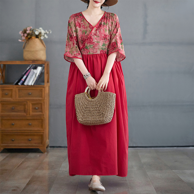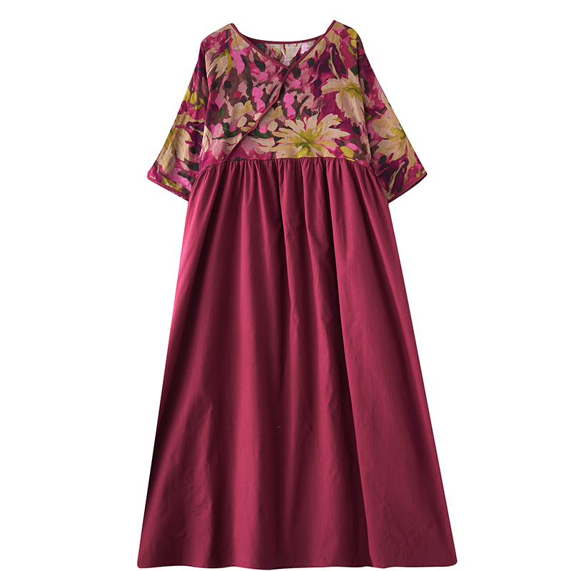 枣红色裙棉麻夏季新款V领拼接复古风连衣裙中老年妈妈装大码长裙