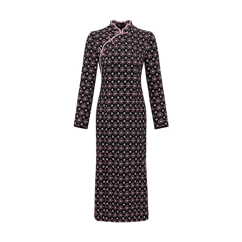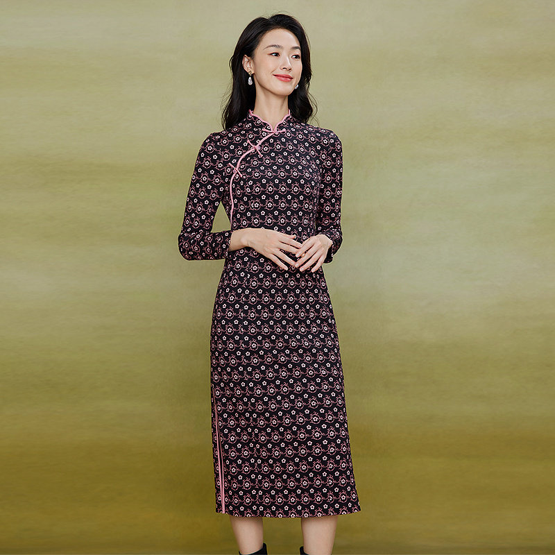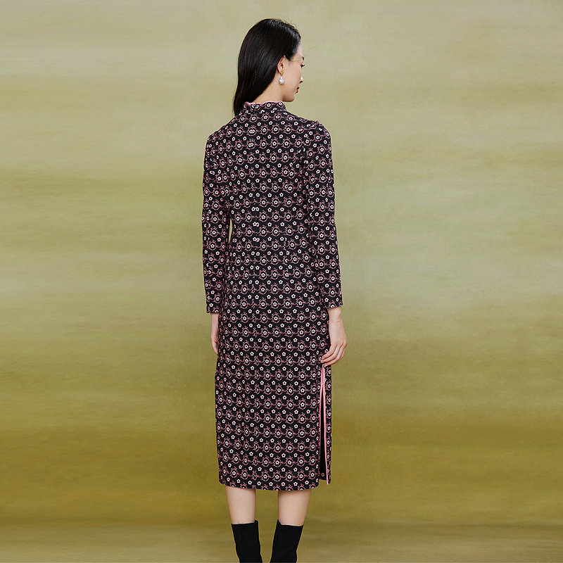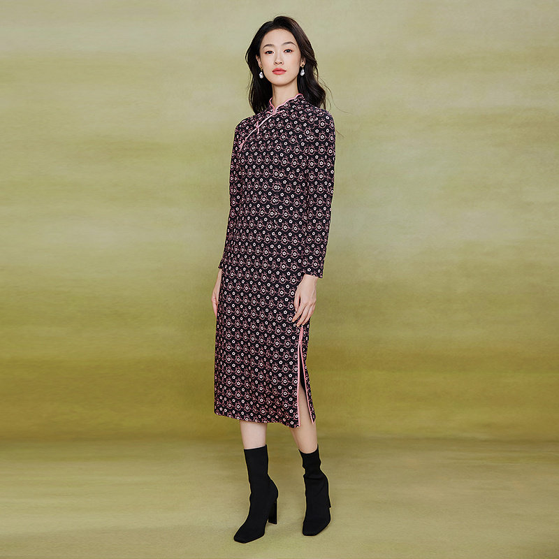 黛玛诗显瘦花裙子秋冬新款国风碎花开叉旗袍针织连衣裙女优雅复古
