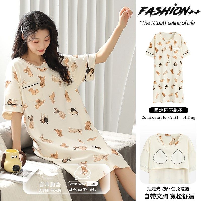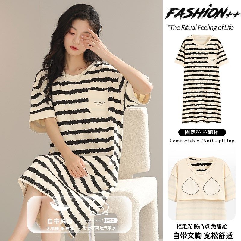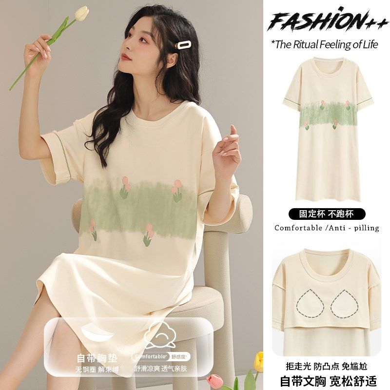 夏季女款带胸垫一体睡衣短袖2024新款外穿孕妇纯棉薄款睡裙家居服