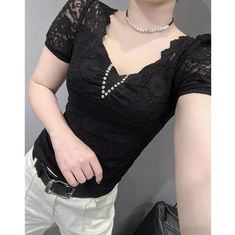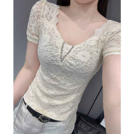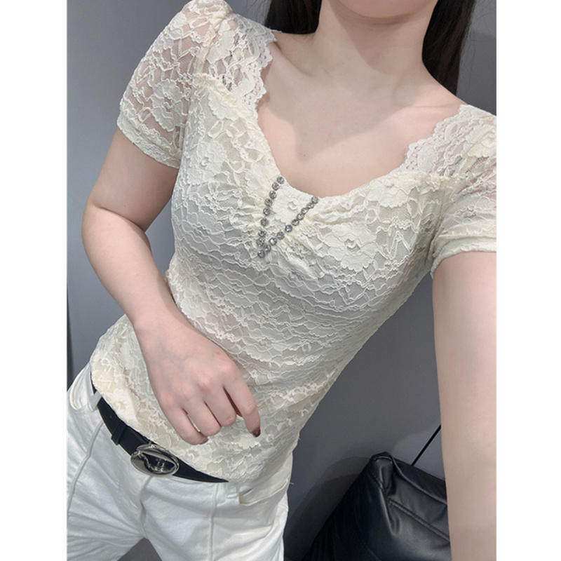 欧洲站夏新款蕾丝方领短袖T恤女设计感钉珠气质修身弹力上衣小衫