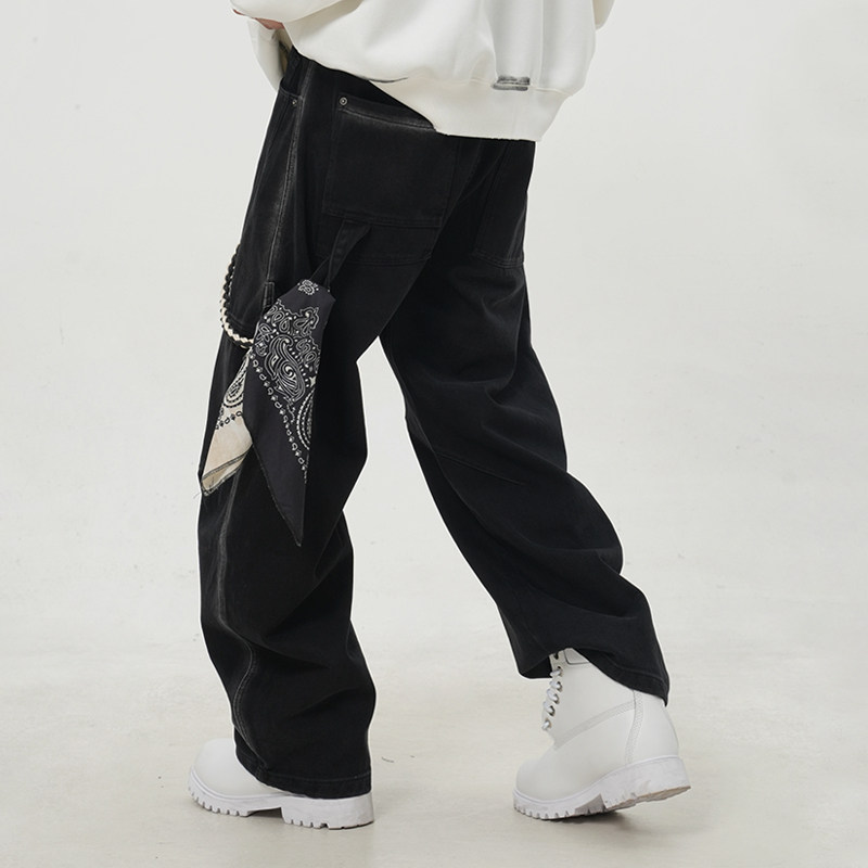 青少年水洗松紧腰抽绳男牛仔裤2025秋季潮牌个性复古直筒弯刀裤